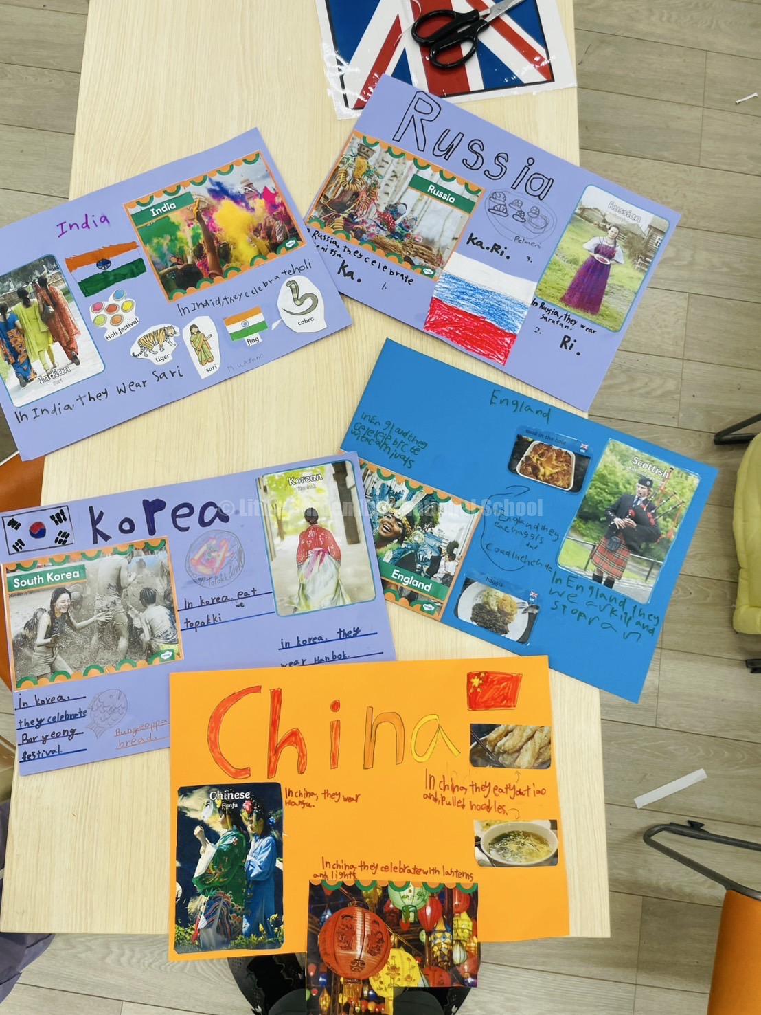 ・世界各国の文化を紹介するポスターを作成し、多様な文化に対する理解と敬意を深めました。
