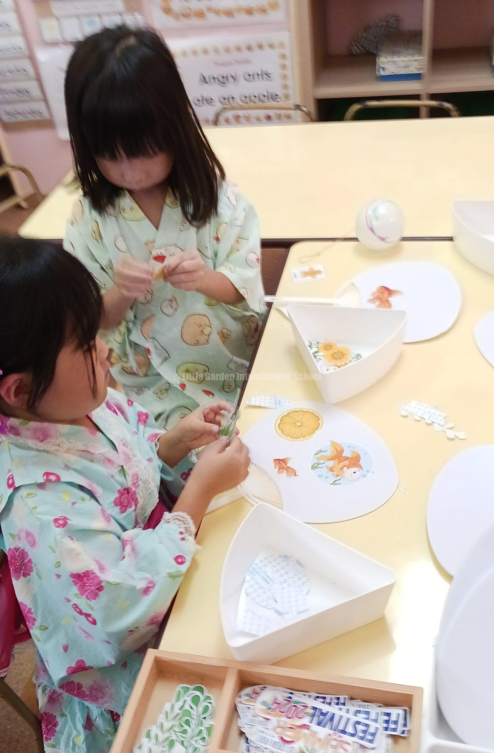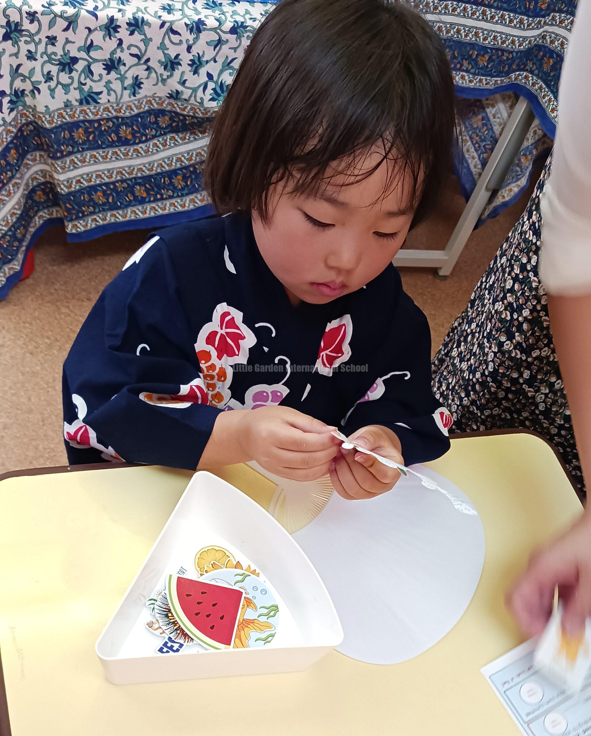 クラフトコーナーでは、うちわを作りました。祭りといえば、うちわですよね?!自分たちでステッカーを選び、素敵な作品ができました。