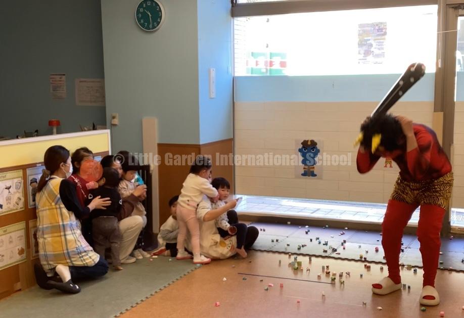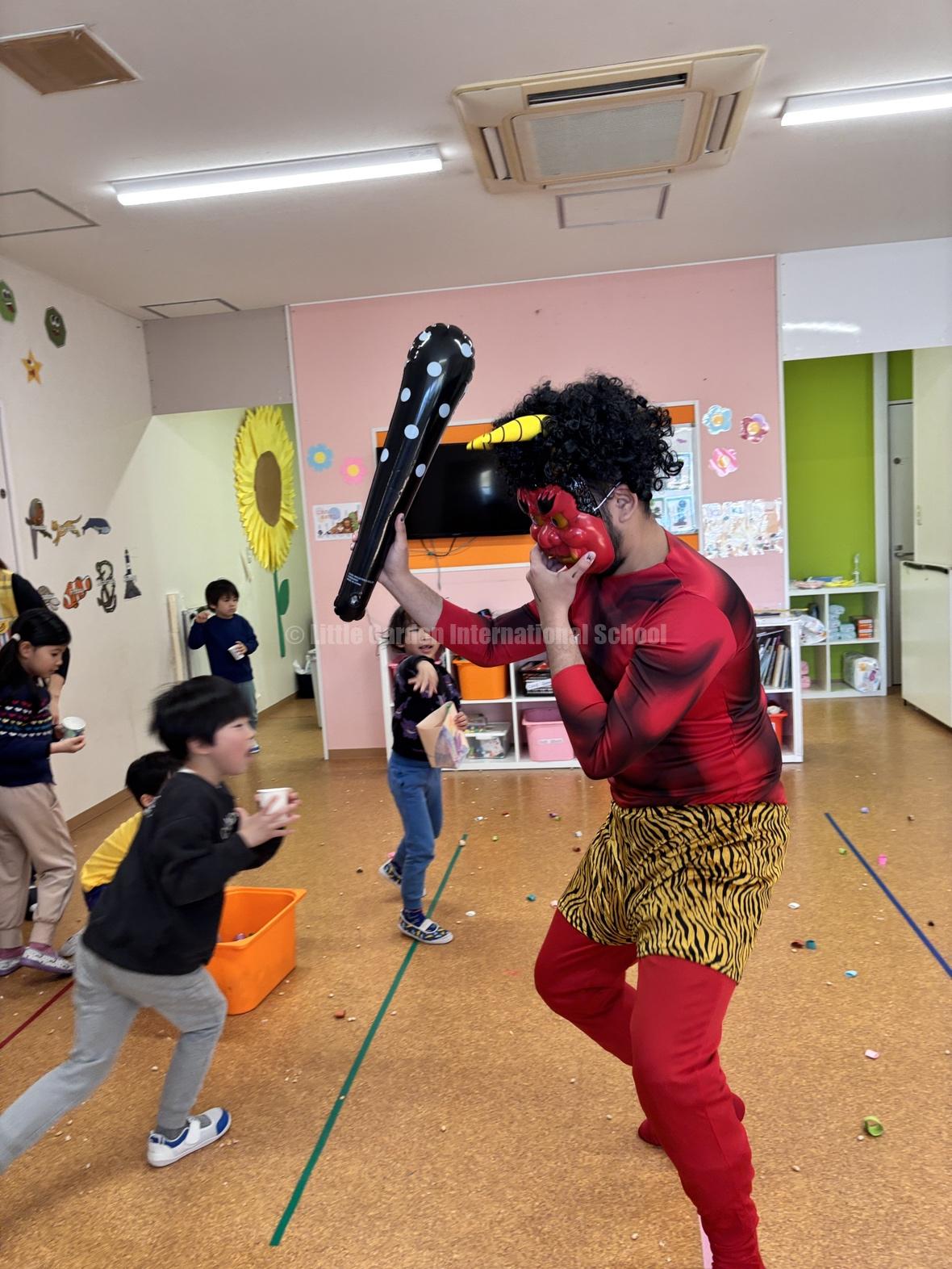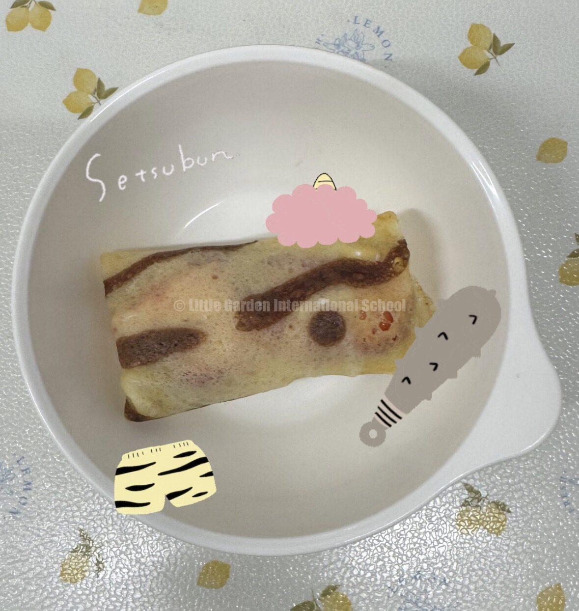 Today was Setsubun! We started with stories and songs. Suddenly, an “Oni” (ogre) came into the room, and everyone started screaming! Some children cried at first, but they were very brave. They threw beans and shouted “Go away, Oni!” until the monster left.After the fight, we ate yummy homemade “Oni Crepes.” The children were so happy to eat the cute monsters! It was a great day of courage and sweet treats.