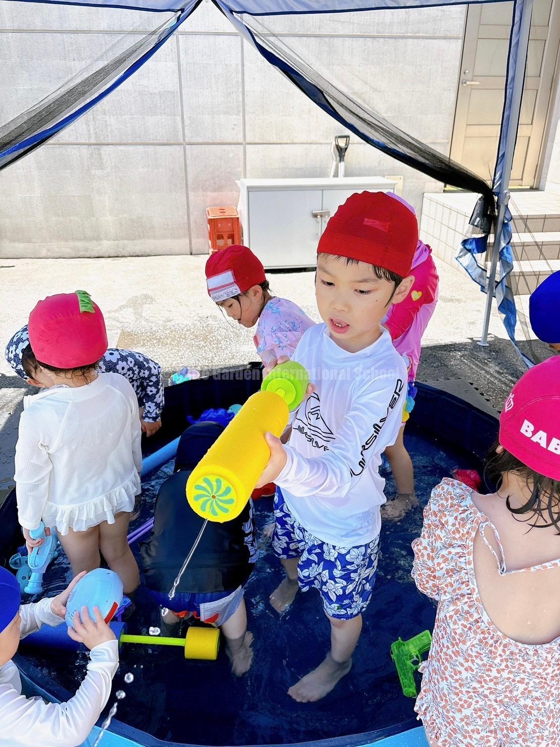 2024年度の水遊びが始まりました!1か月前くらいから「Water playまだ?」と楽しみにしていた子どもたち。水遊びの日は一段と子どもたちのワクワク感や表情が伝わってきます。プールでの水遊びはもちろんのこと、水着への着替えやお片付けまで、はり切って取り組んでいる様子が見られます☺