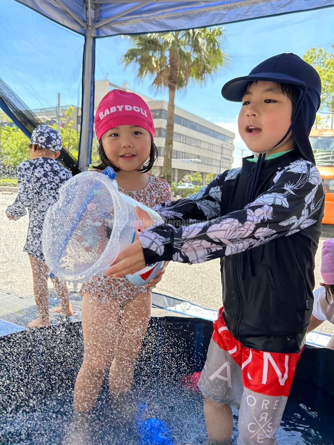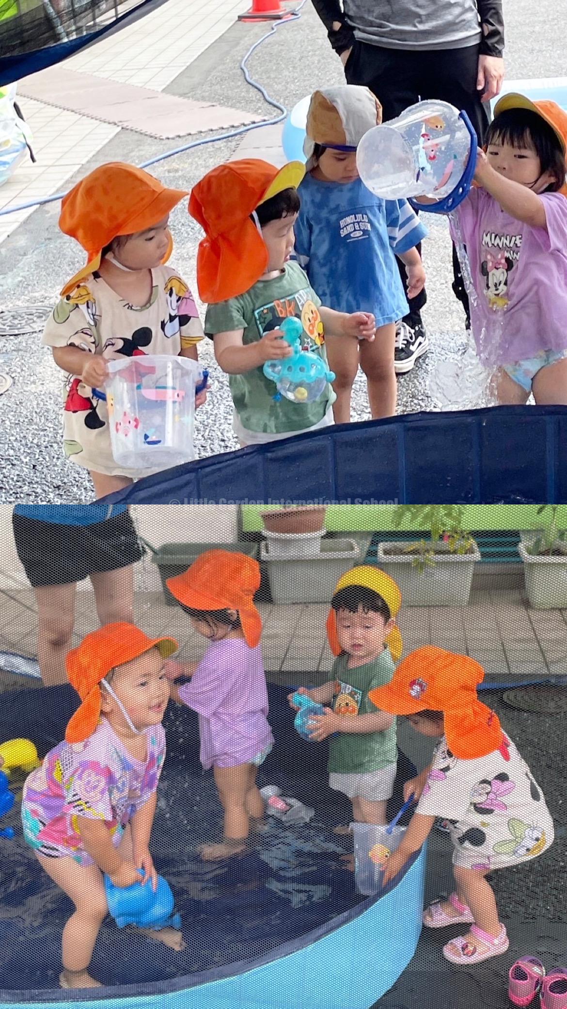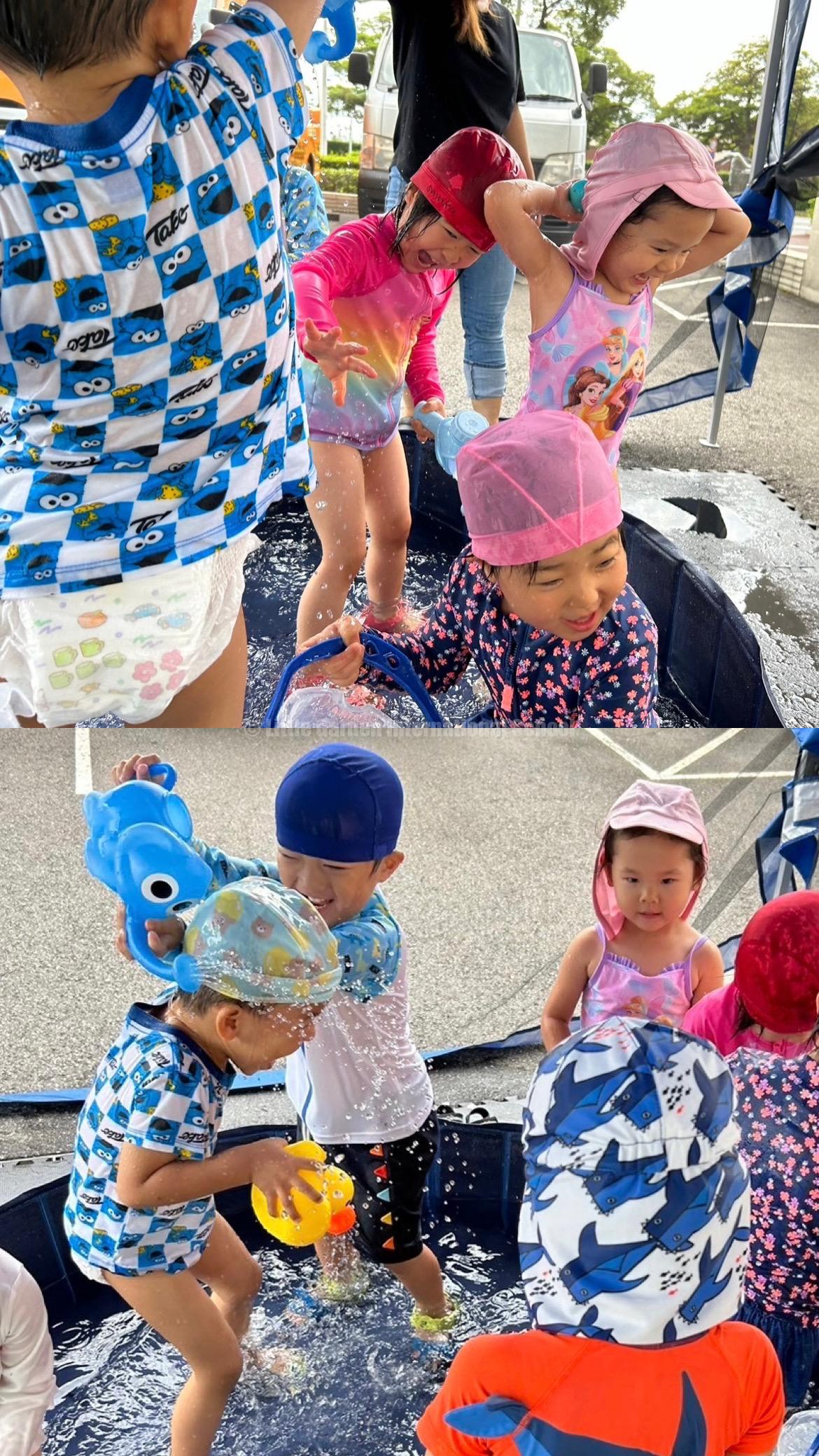 水鉄砲や小さなじょうろバケツを手に、それぞれ思い思いの遊び方でつめたい水の心地よさやしぶきを全身で感じています。お水遊びもへっちゃらだよ!お友達や先生と関わり合いながらニコニコの笑顔で夢中になって遊んでいました✨