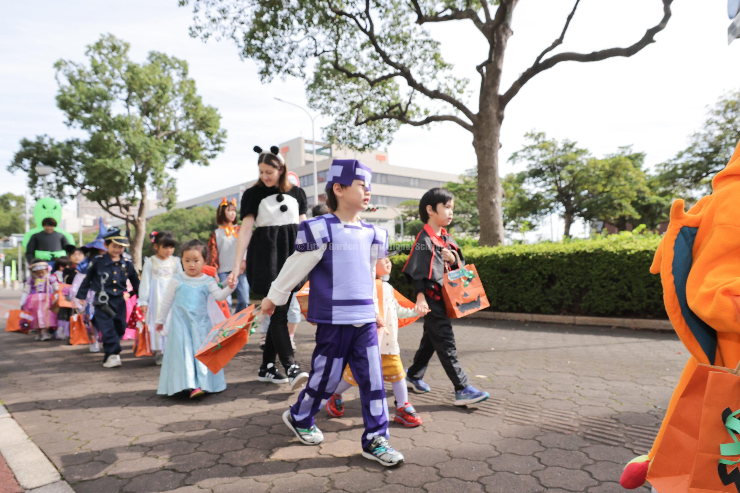 子どもたちは嬉しそうにお菓子を受け取り、「やったー!!snack!!」などと友達同士で話しながら、楽しんでいました。パレードでは、仮装したまま千葉ポートタワーまで歩き、道行く人々に声をかけながら行進しました。写真を撮り合い、楽しい時間を過ごしました。