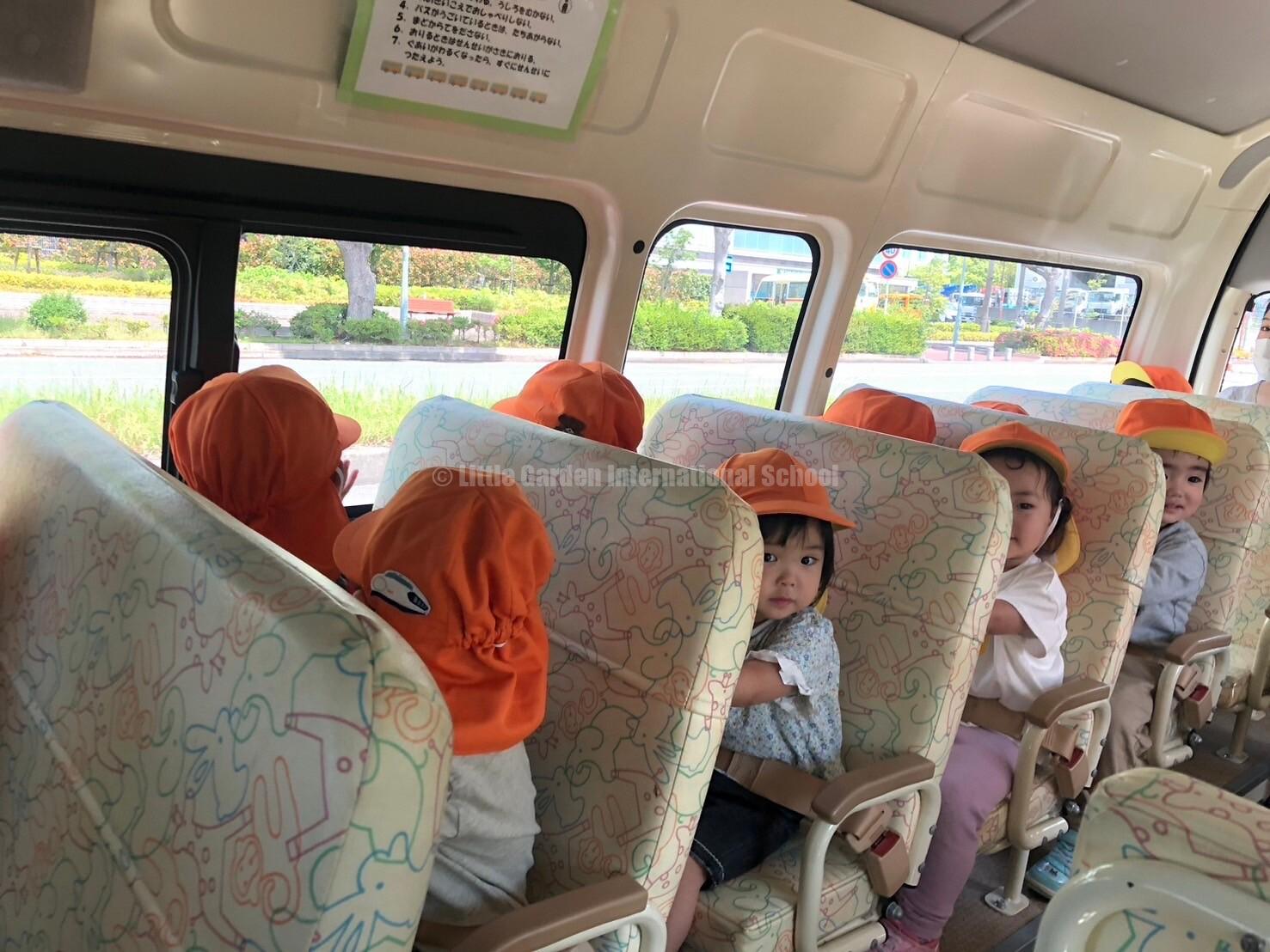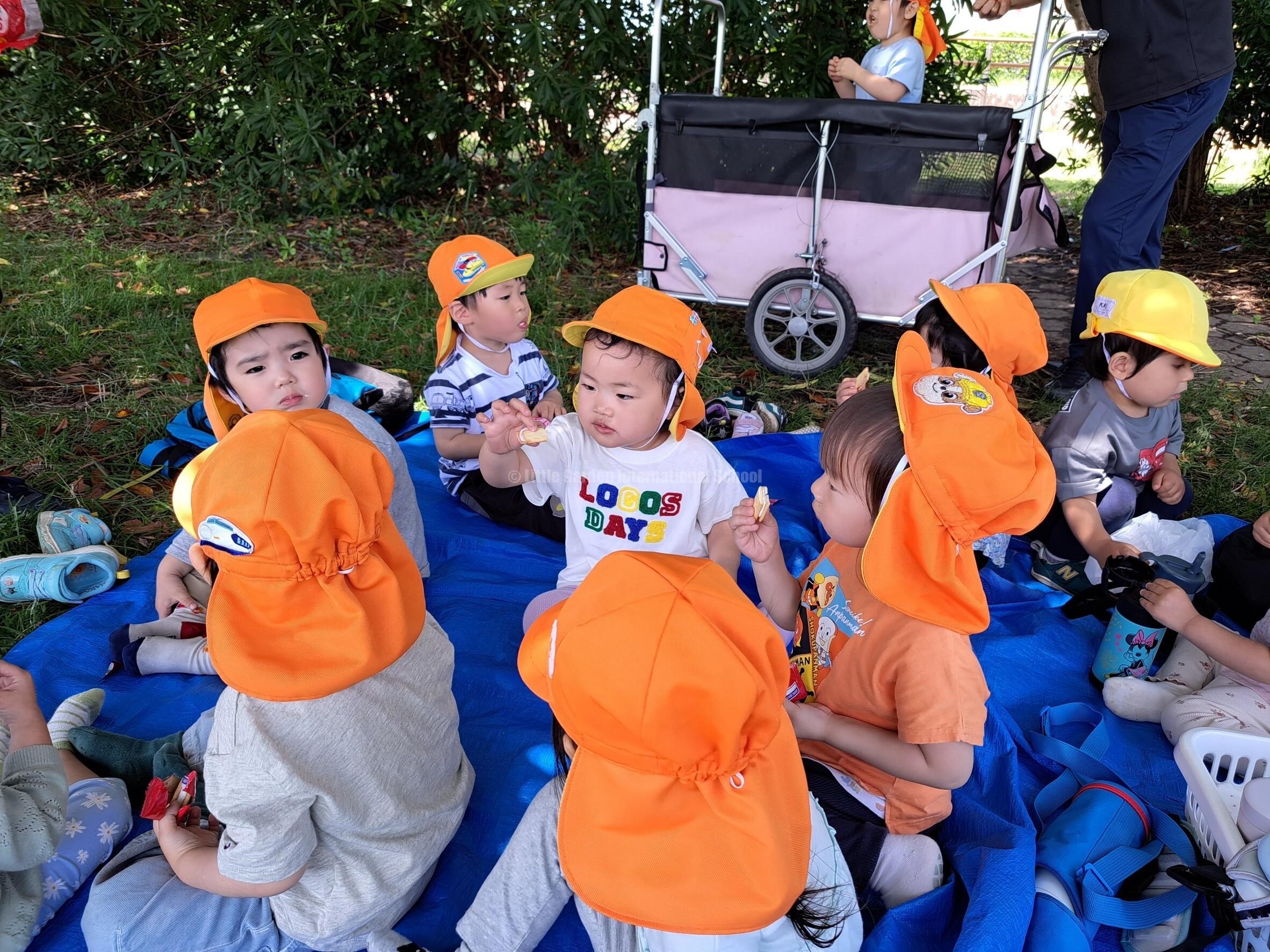 Besides going to the park, we also went on a picnic. The photos below were taken on a picnic day for the younger classes, Star, Nursery and Preschool. The children look happy as they eat snacks in the park and they enjoy the bus ride, too!
