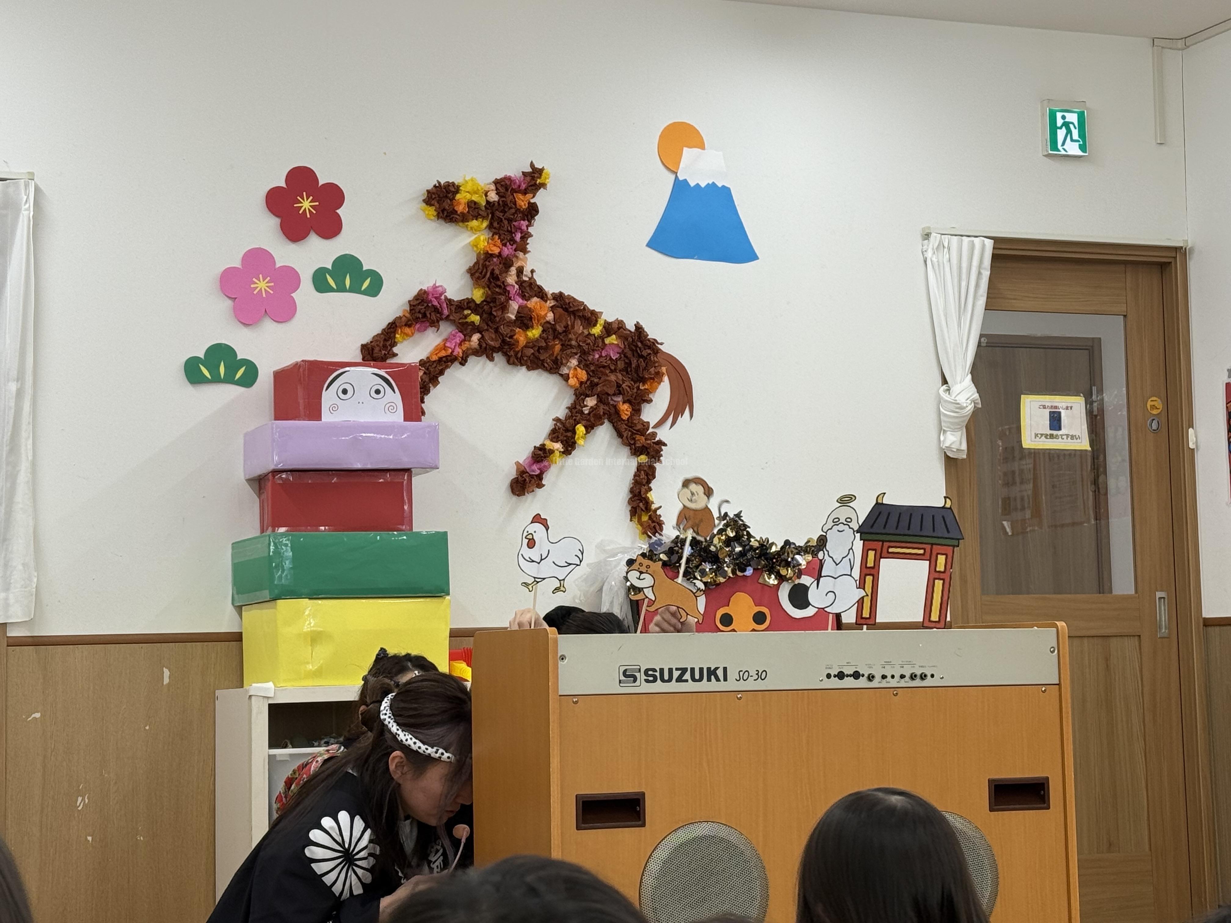 お正月の歌をみんなで唄った後は、ペープサートで十二支のお話を…