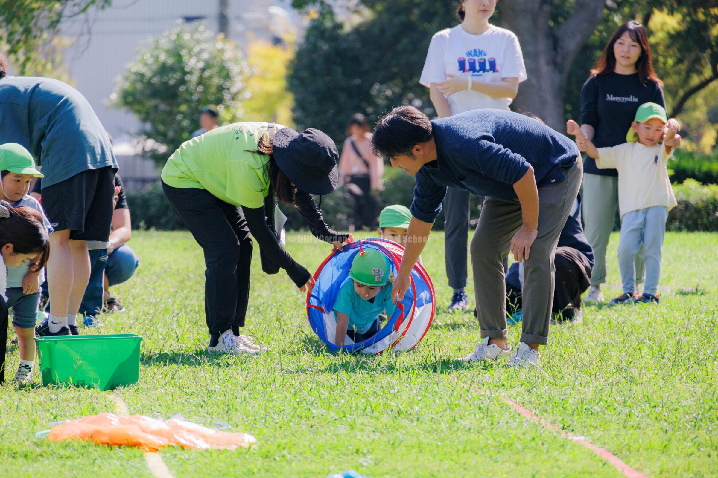 幼児組さん、うさぎ組さんのパパママと一緒に、トンネルを抜け衣装に着替えるレース😁衣装は自分で作った衣装に身を包みみんな楽しそうです💕