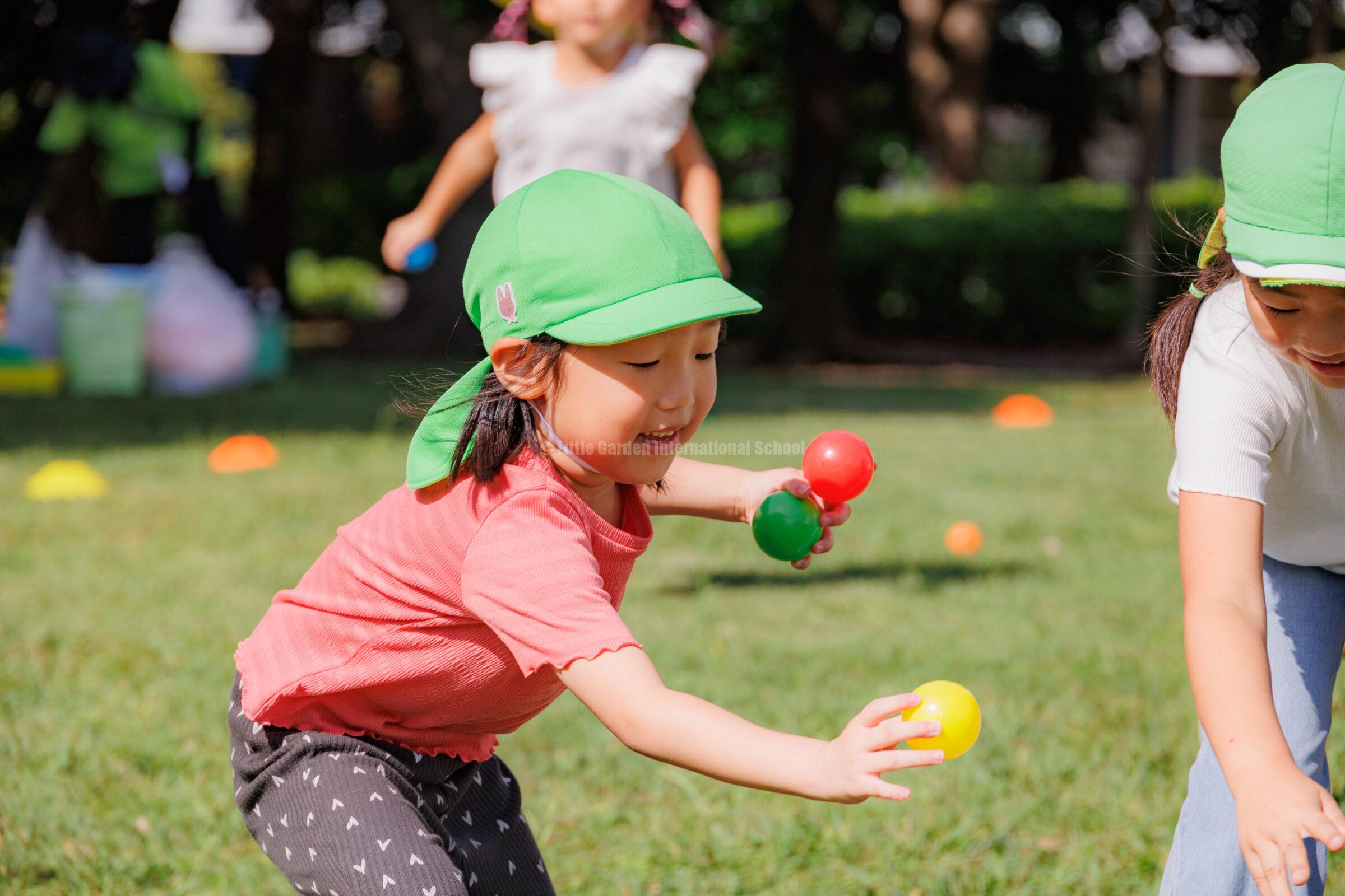 幼児組さんの「ダンシング玉入れ」☄️保育者の持つ箱に上手にボールを入れていました!曲がかかるとダンス🎶を踊り曲が止まると玉入れに!!耳を澄まして音楽を聞いて頑張っていたね💪