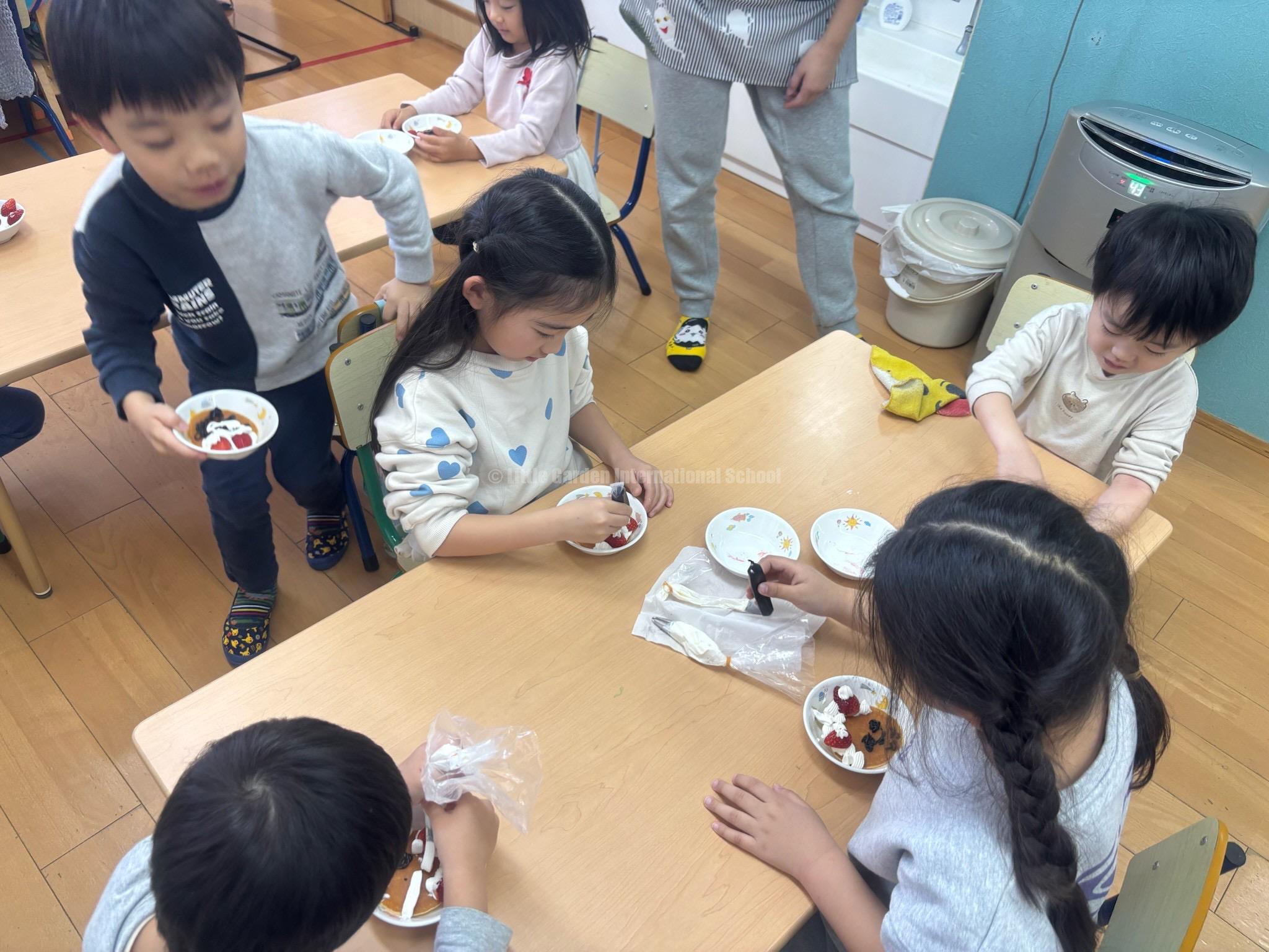 節分の会が終わり、幼児組さんは食育でパンケーキにオニをデコレーション🎶しました☺