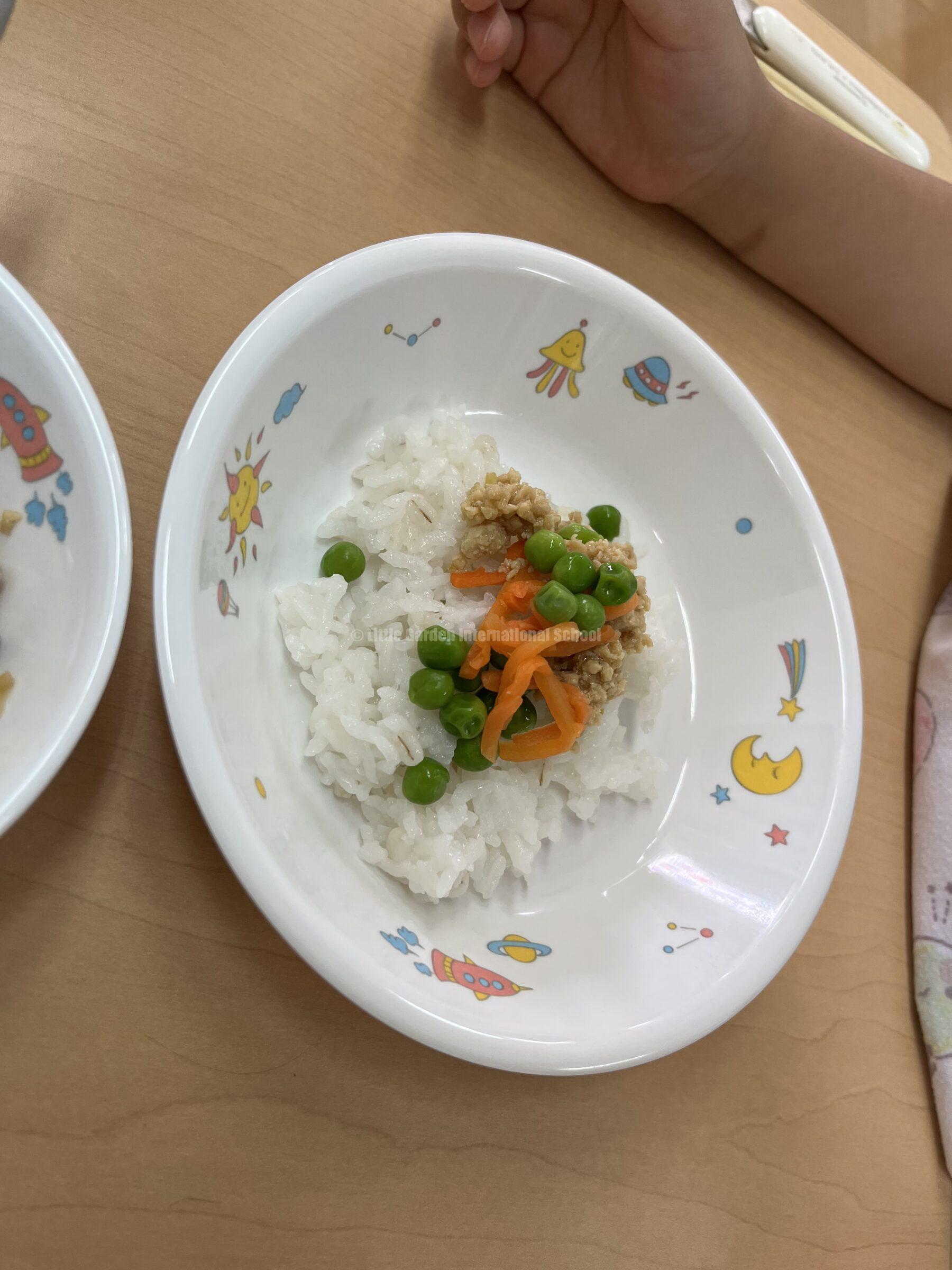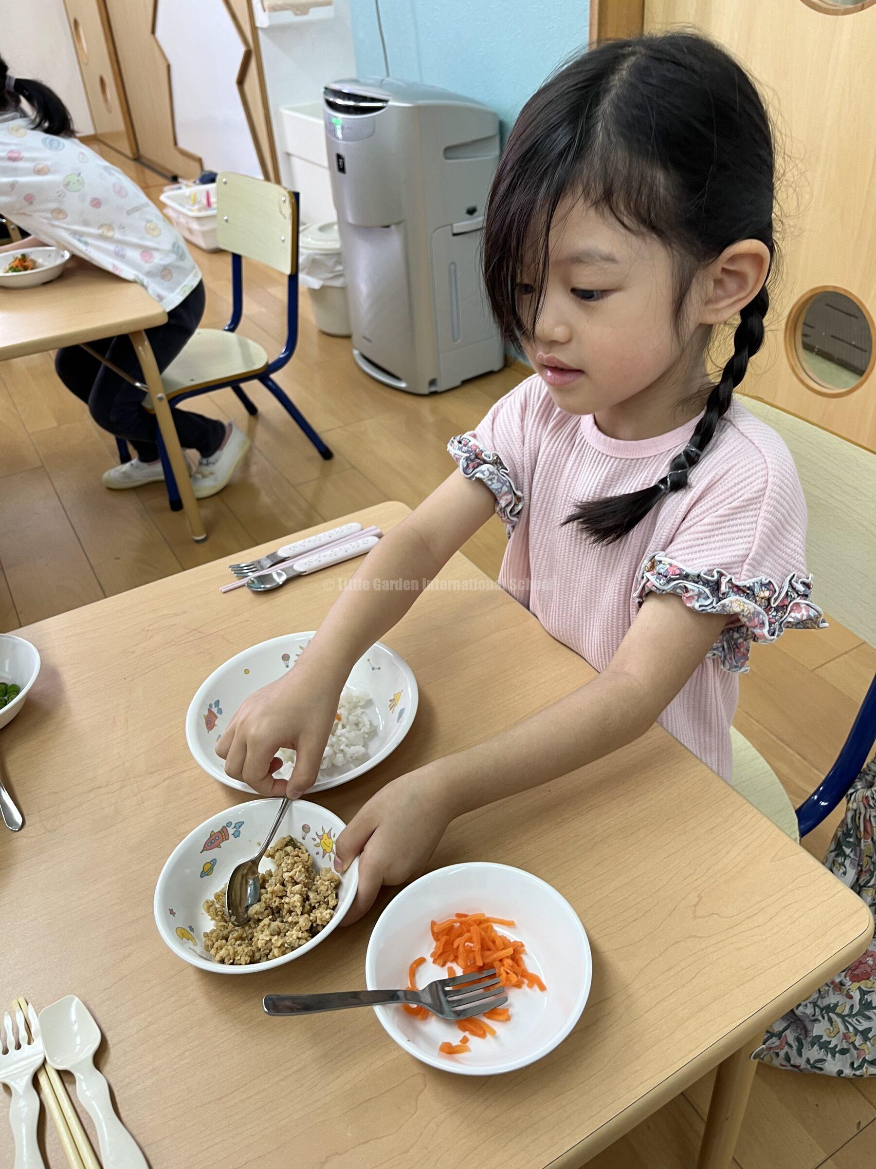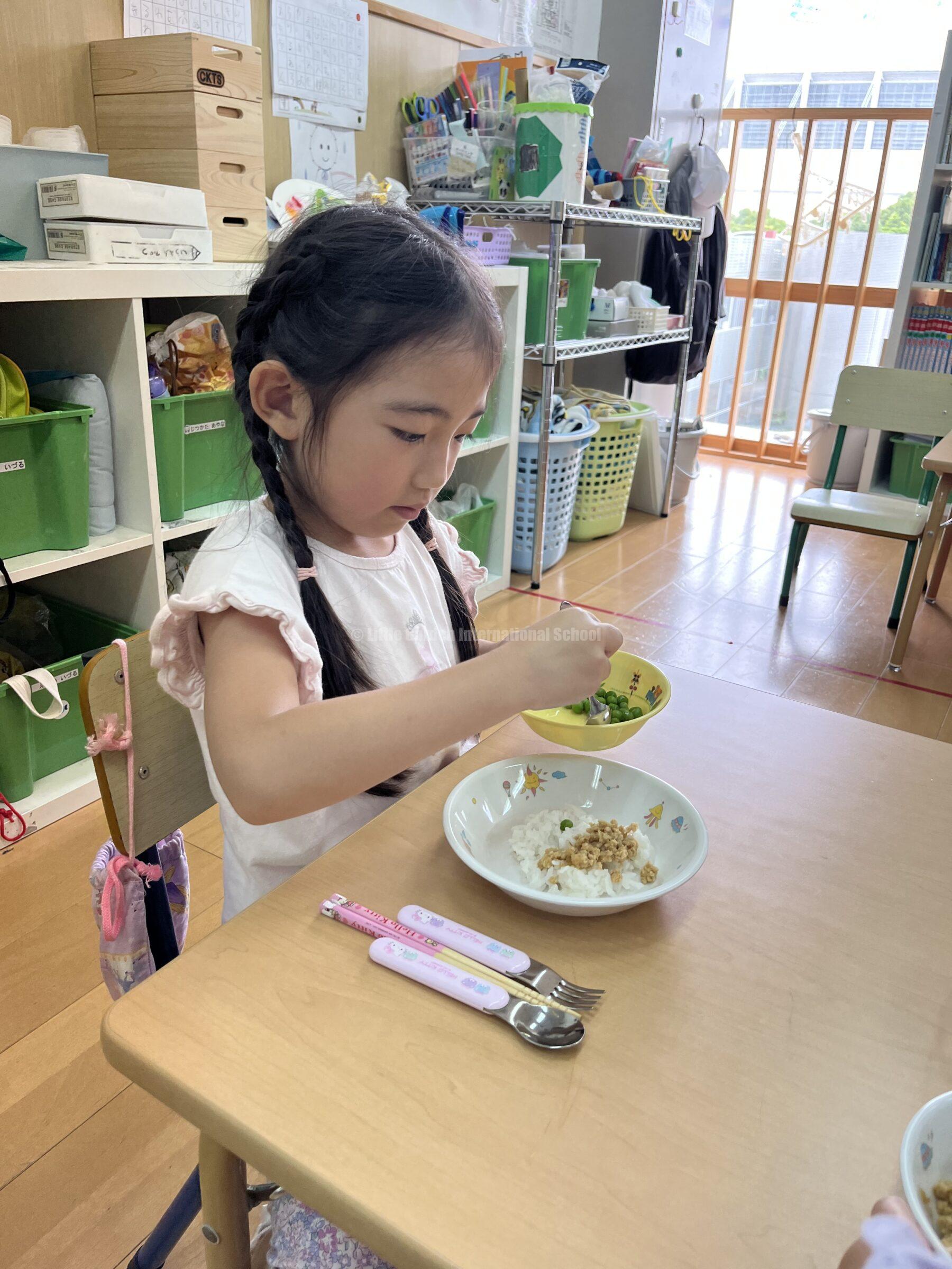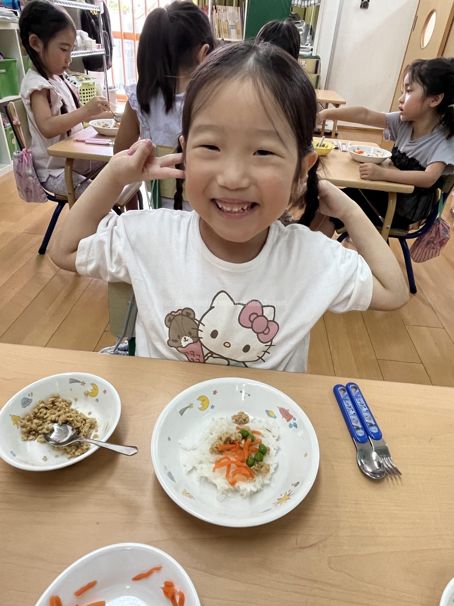 「いただきまーす!!」ご挨拶もしっかりでき、自分の盛り付けたご飯をおいしそうに食べていました♪自分で盛り付けるとおいしさ倍増ですね❤