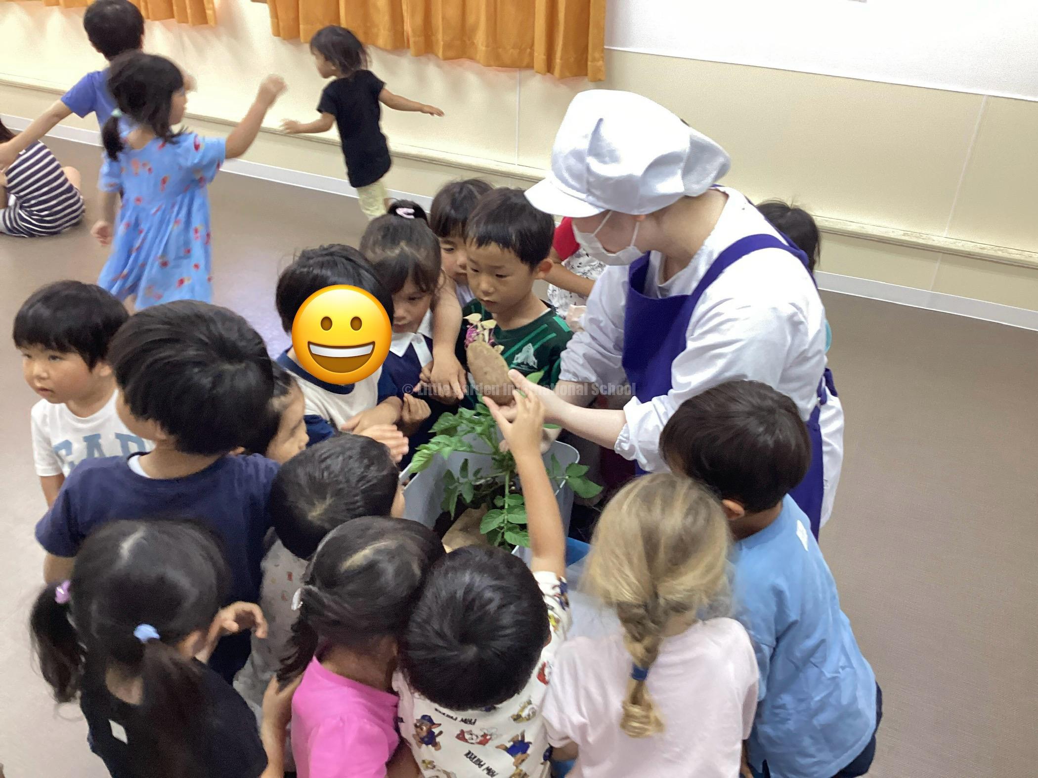 5月はみんなで野菜の種や苗を植えたので種の写真を見せて簡単なクイズをしたり、実際に芽が出たさつまいもや植えて増え始めた小さいじゃがいもを見たりしました。