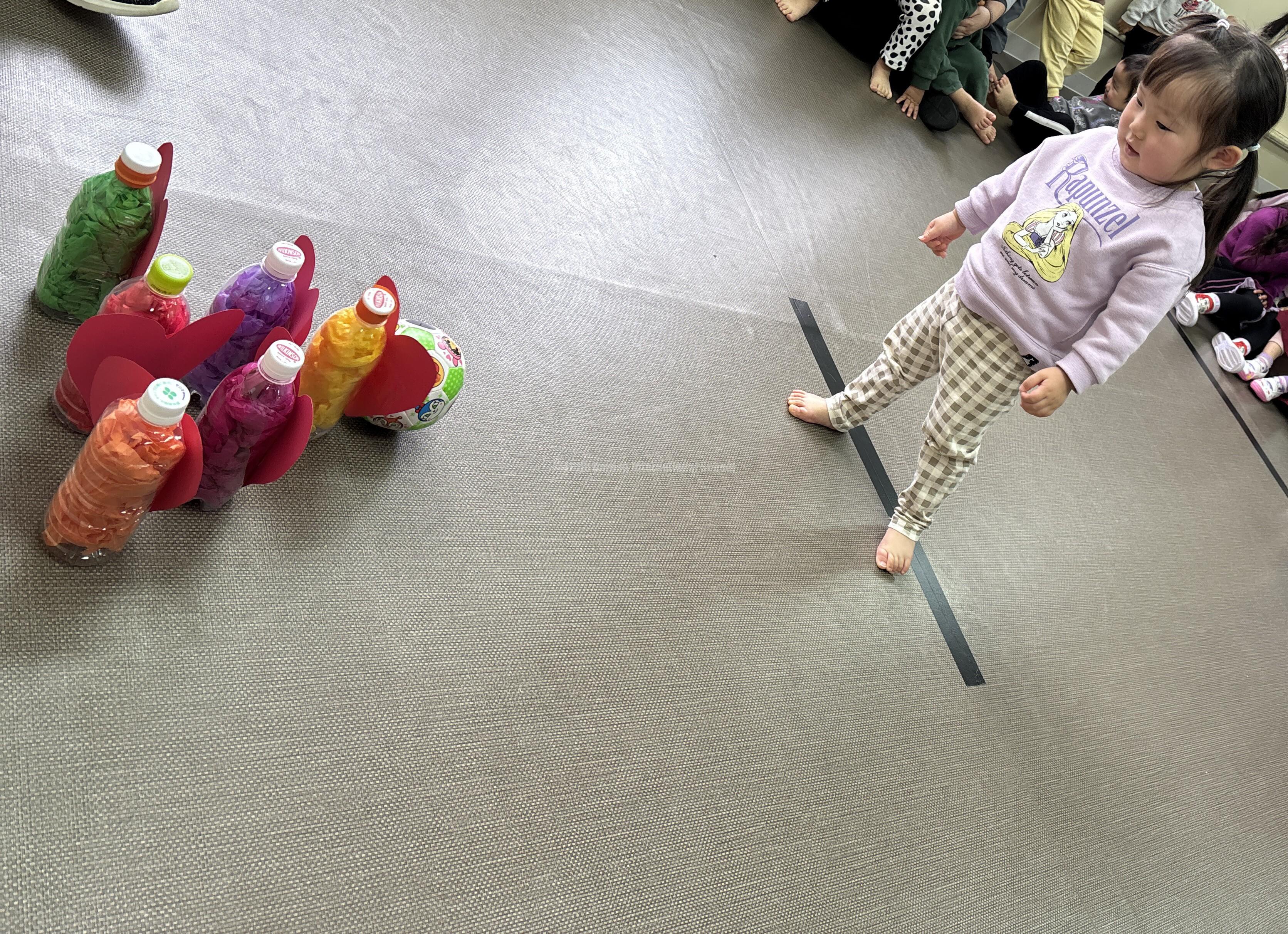コロコロと上手にボールを転がしたり、エイっと思いきり投げてピンを倒したりと思い思いの投げ方で楽しみました😊