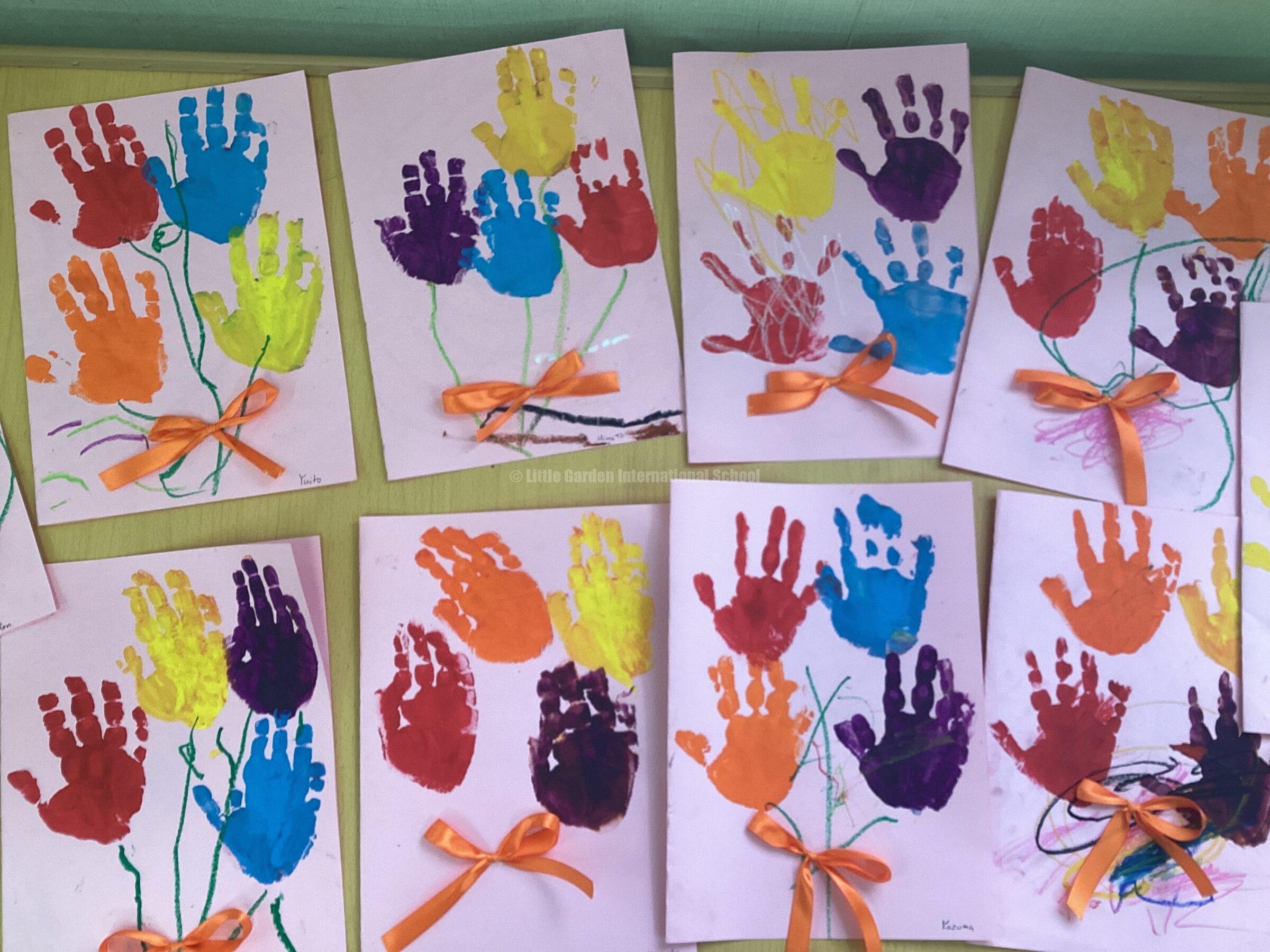Nurseryクラスは、カラフルなペイントを使って手形スタンプ♪とっても素敵なカラフルな花束が出来上がりました🌸