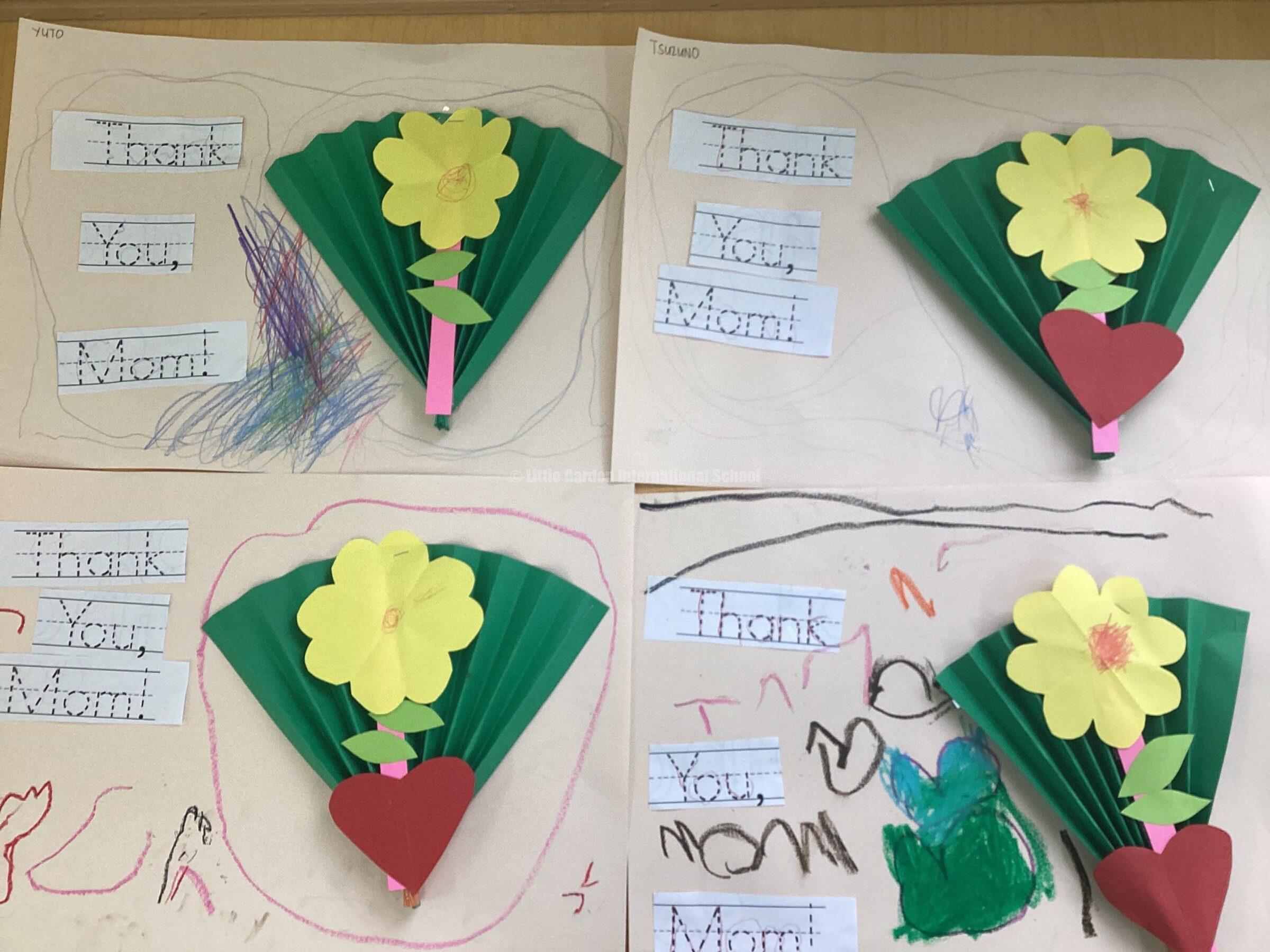 日頃の感謝の気持ちを込めて、まだ文章は書けないので “Thank you, Mom❣” のなぞり書きをしました。子どもたちにとっては難しい作業でしたが、大好きなママにあげるんだ! と言いながら頑張って取り組んでいました。
