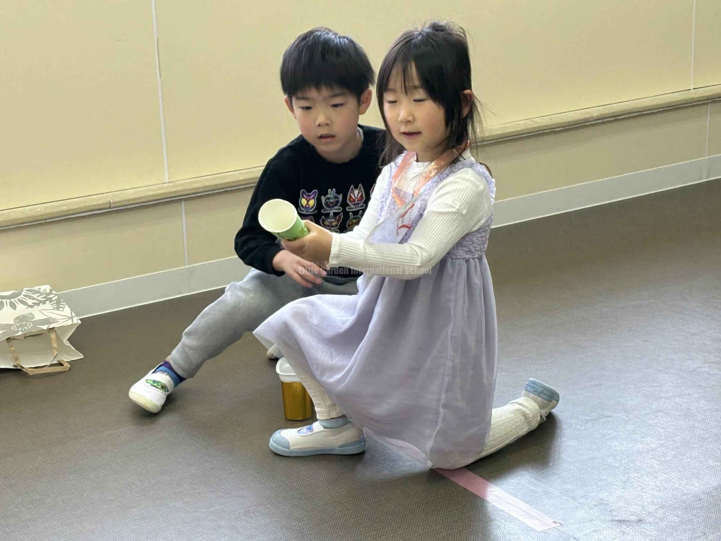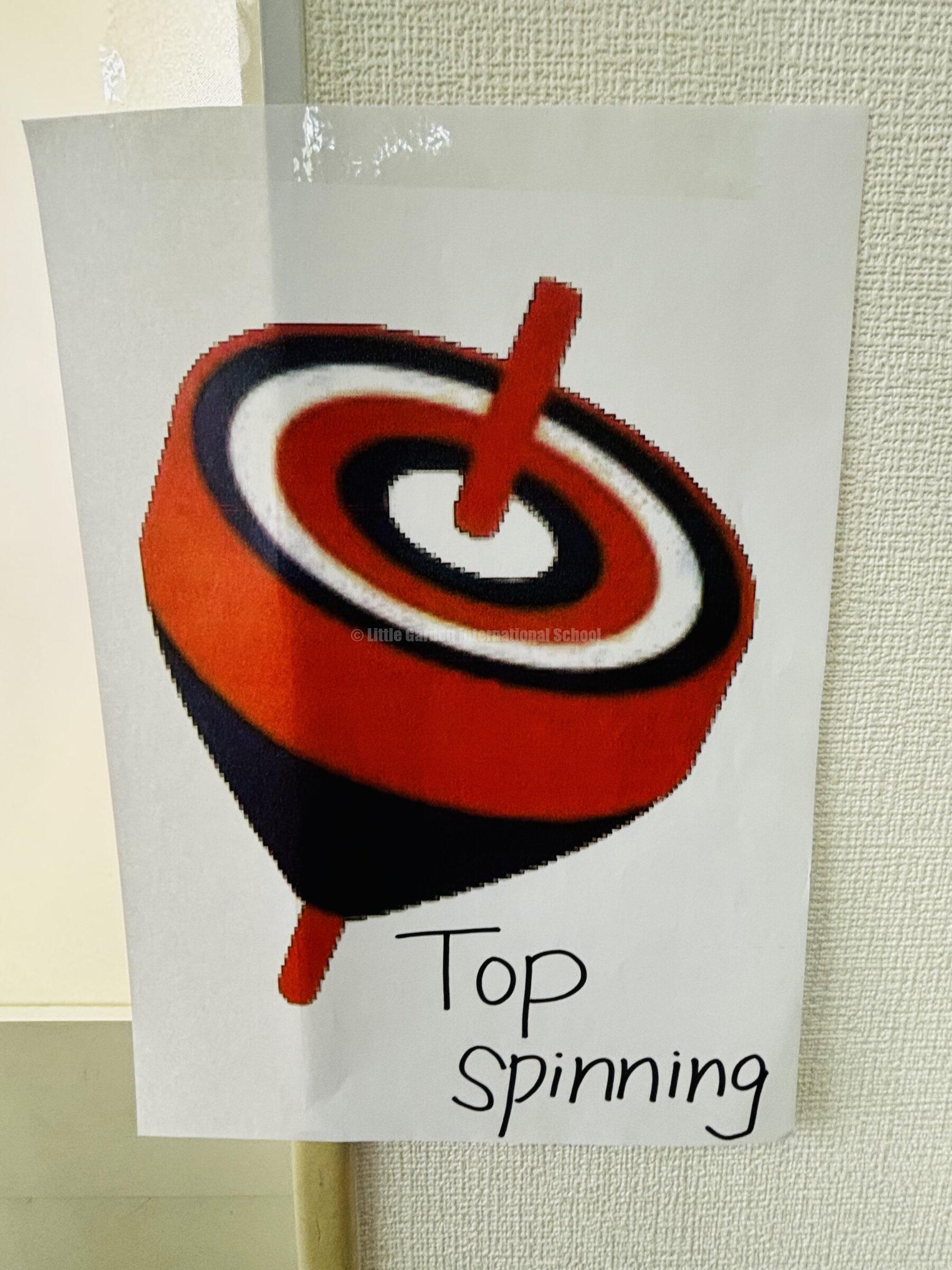 (K2 クラスが牛乳パックで作って絵を描いた手作りのコマ。長く回り続けた方が勝ち❕)