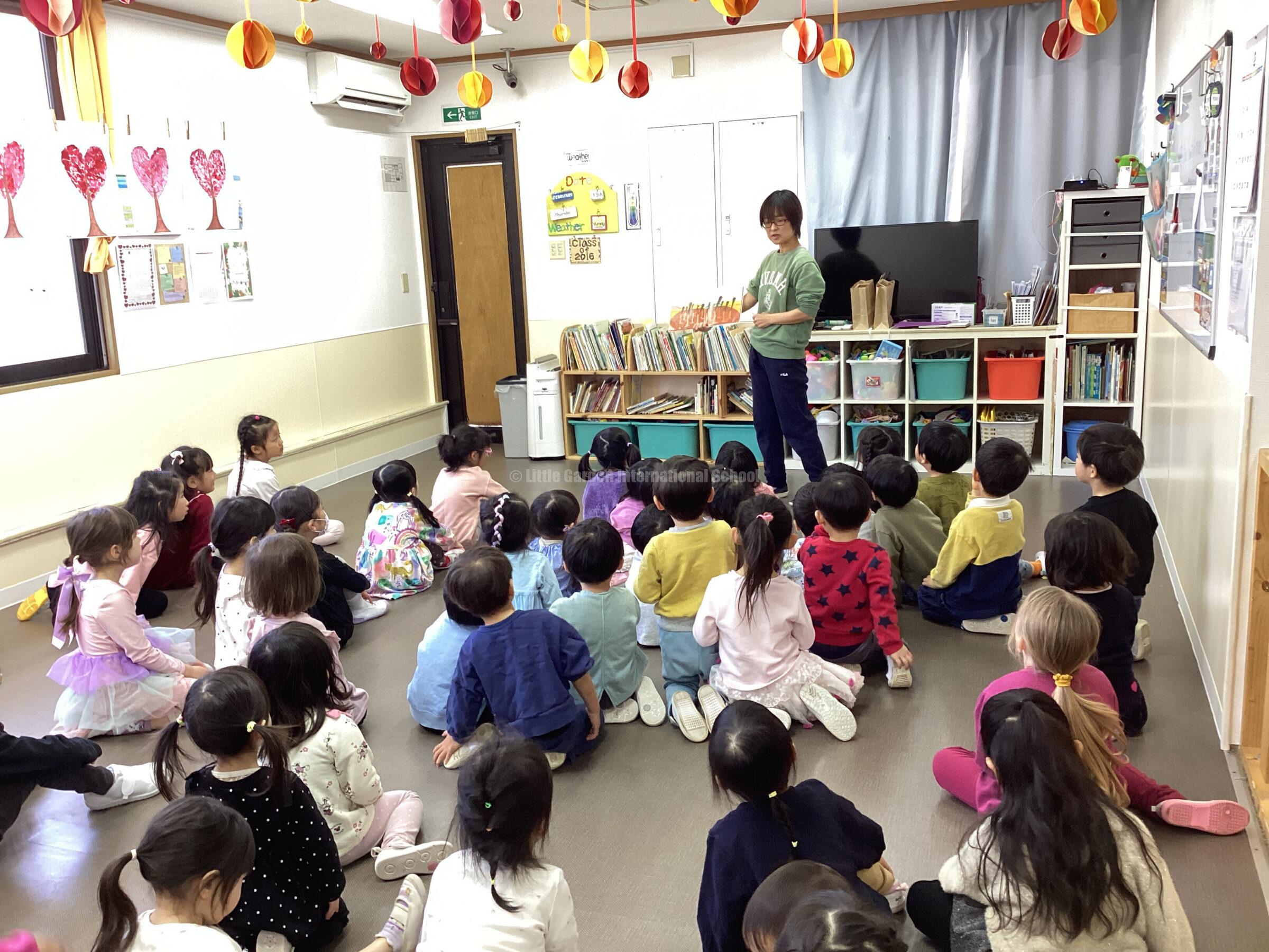 次は Story Time。「チョコレートパン」と「がまんのケーキ」という絵本の英語での読み聞かせ。鯉の男の子がケーキを食べずに待つのがつらくて自分のしっぽをしゃぶってしまう場面でこどもたちは大笑い。