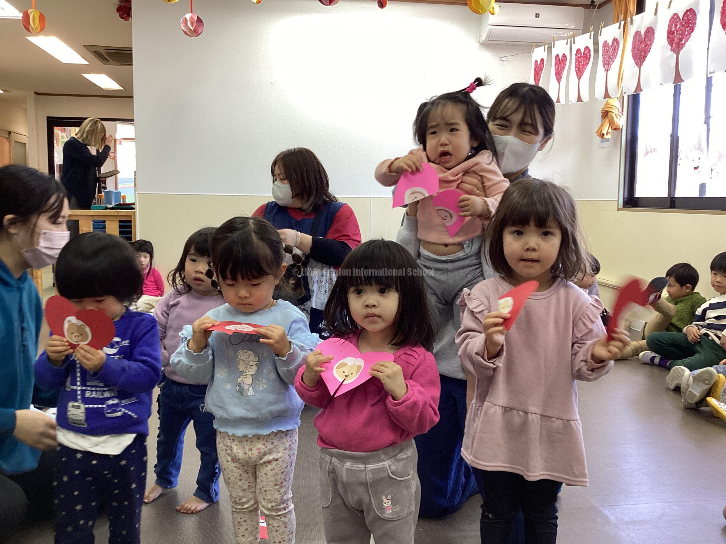 お昼寝の後はお待ちかねのスナックタイム。キッチンの方が焼いてくださったバレンタインクッキーを食べました。キラキラのトッピングがのったサクサクの手作りクッキー。その味は格別で、まさに「Amazing!」キッチンスタッフのさな先生とのりこ先生、お忙しい中のご協力、本当にありがとうございました。おかげさまで「LOVE」と「Smile」にあふれた幸せいっぱいのバレンタインパーティーとなりました💛