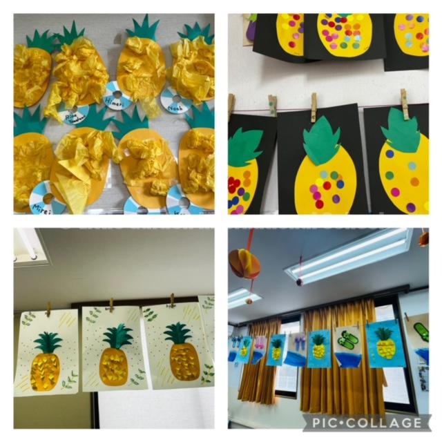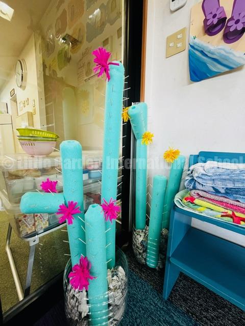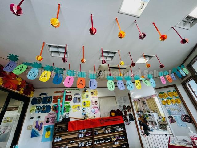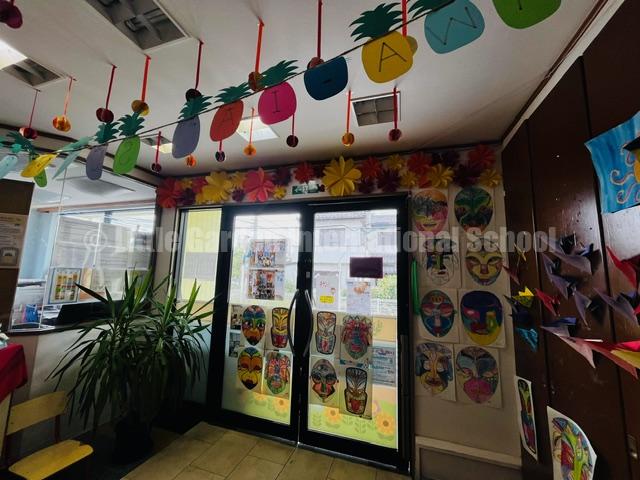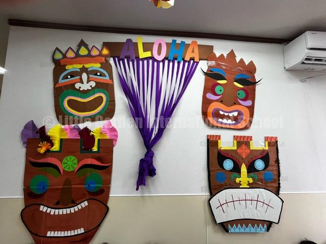 According to the Hawaiian theme, the school entrance was decorated by the kids with tiki mask , cactus crafts and many other things as follows ;