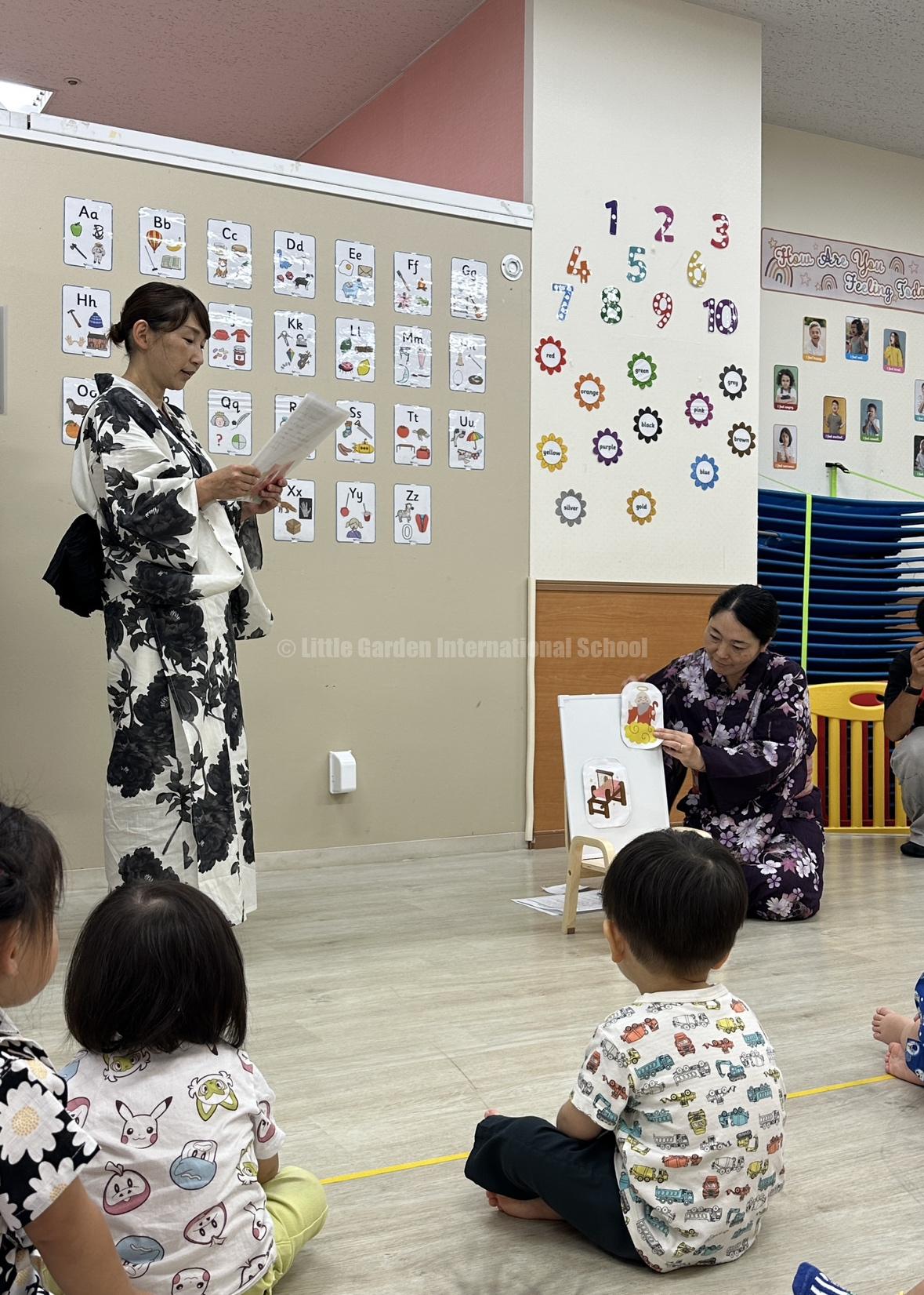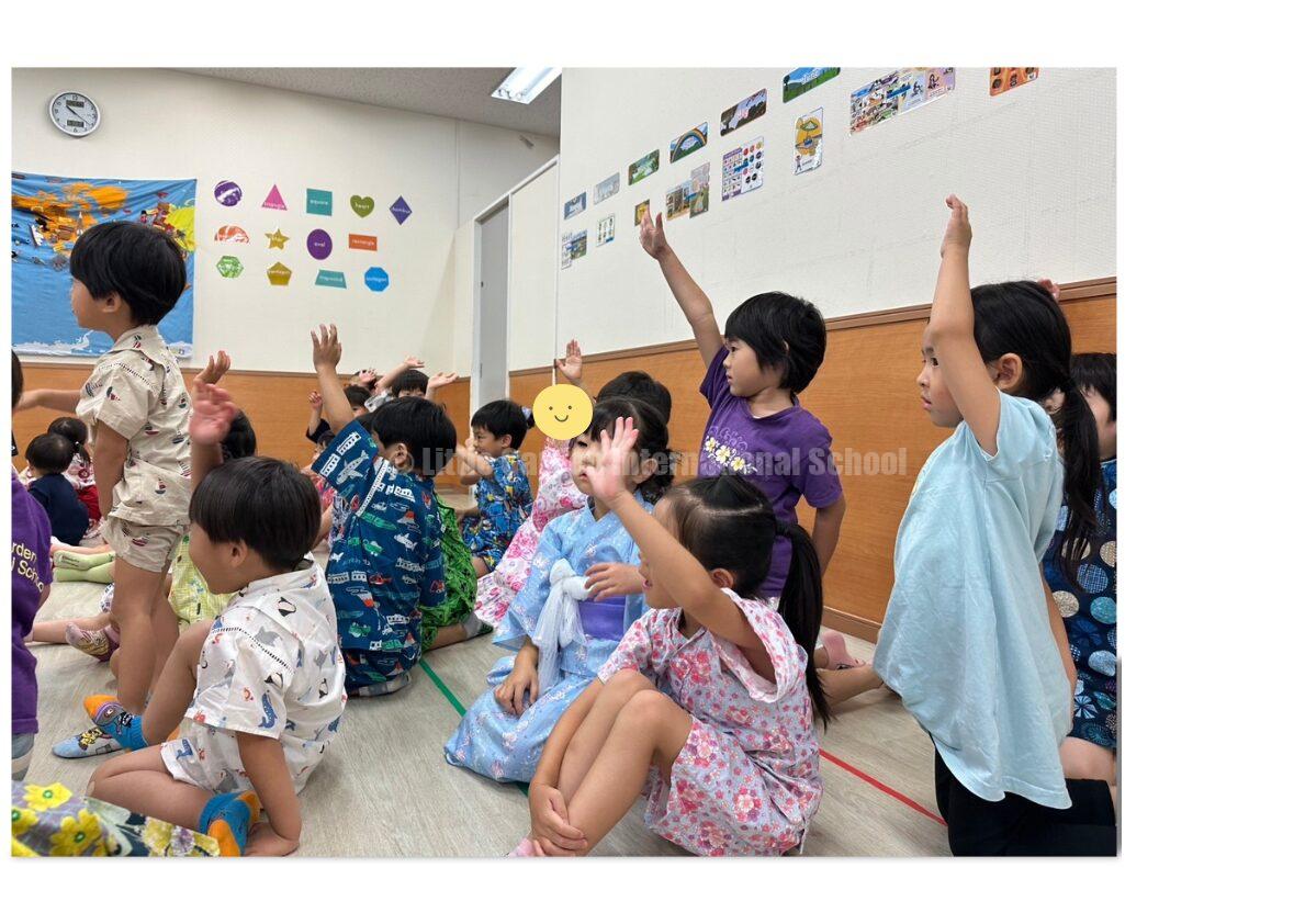 We celebrated the Tanabata Festival on July 7th, and many of our little friends came dressed in Jinbei or Yukata! Even the teachers joined in the festivities by wearing Yukata. We began the event with a story about Orihime and Hikoboshi—our little listeners were all ears and paid close attention.