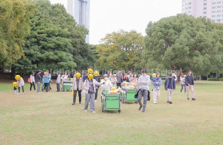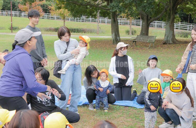 公園に到着すると、普段は大きなクラスを担当している英語の先生と一緒に歌を歌ったり、親子での触れ合いの時間を楽しみました。