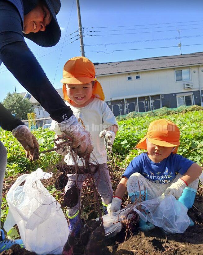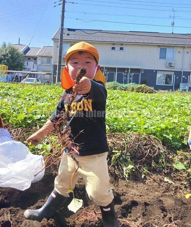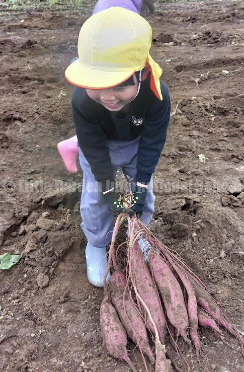 さらに、友達と協力し合って収穫したり、成功や発見を分かち合ったりすることで、協調性や思いやりも育まれます。今回のさつまいも掘りでは、子どもたちが自発的に声をかけ合い、「ここを手伝ってあげるよ!」と自然と助け合う様子も多く見られました。