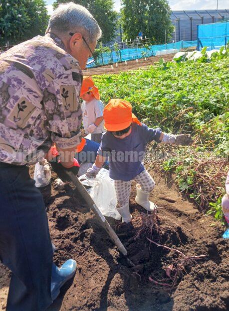 特に5歳児クラスの子どもたちは、今年の5月に自分たちで植えたさつまいもの苗がどれだけ育ったか楽しみで仕方がない様子。広い「LCファーム」に到着すると、子どもたちは大きな畑を見て「わあ!広い!」と歓声をあげ、大興奮でした。