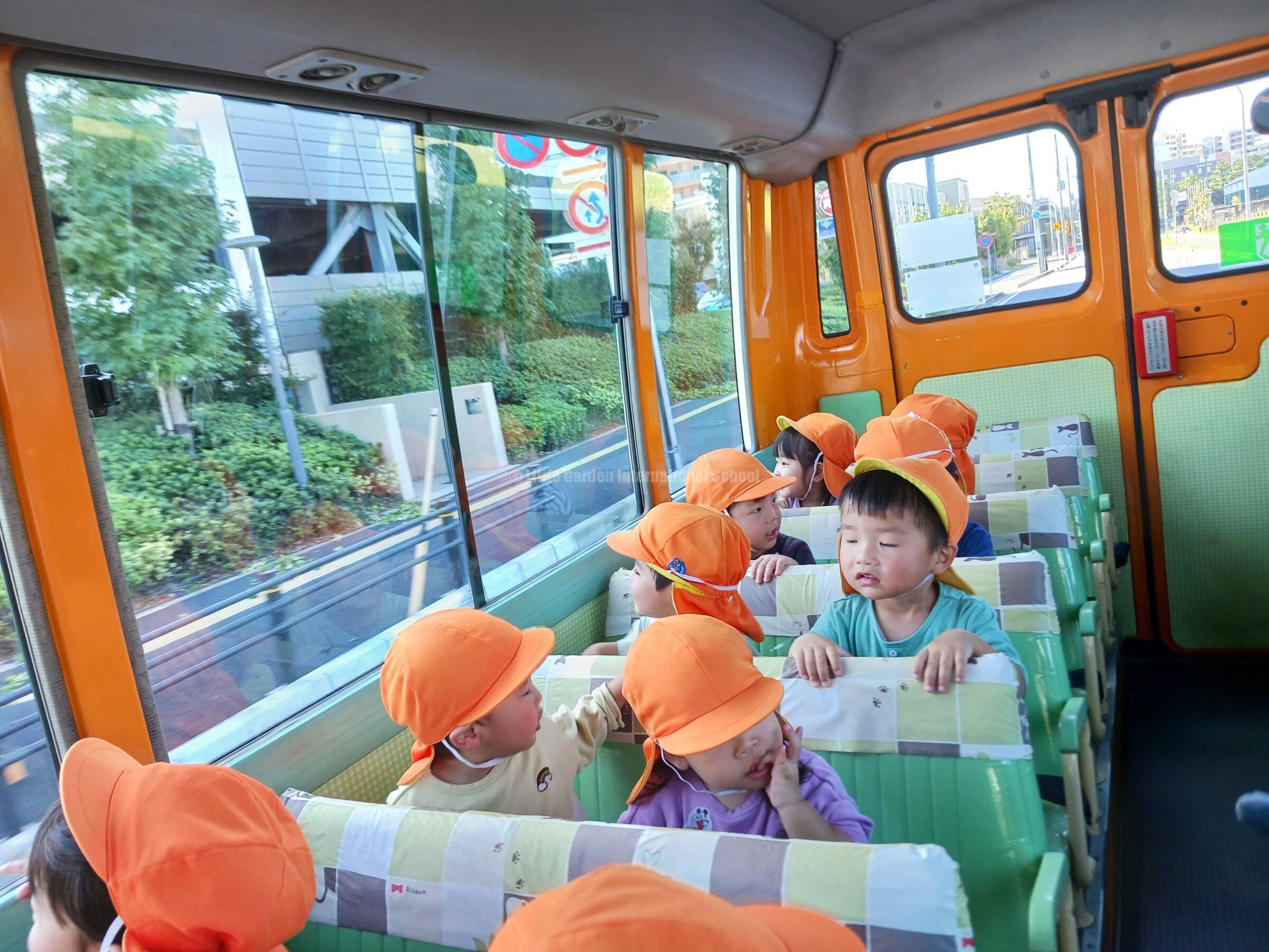 3・4歳児にとっても初めてのバス体験はドキドキとわくわくが入り混じり、朝からとても賑やかでした。「100個とる!」「ぼくは200個!」と張り切る声も聞こえ、子どもたちの期待感がバスの中にあふれていました。