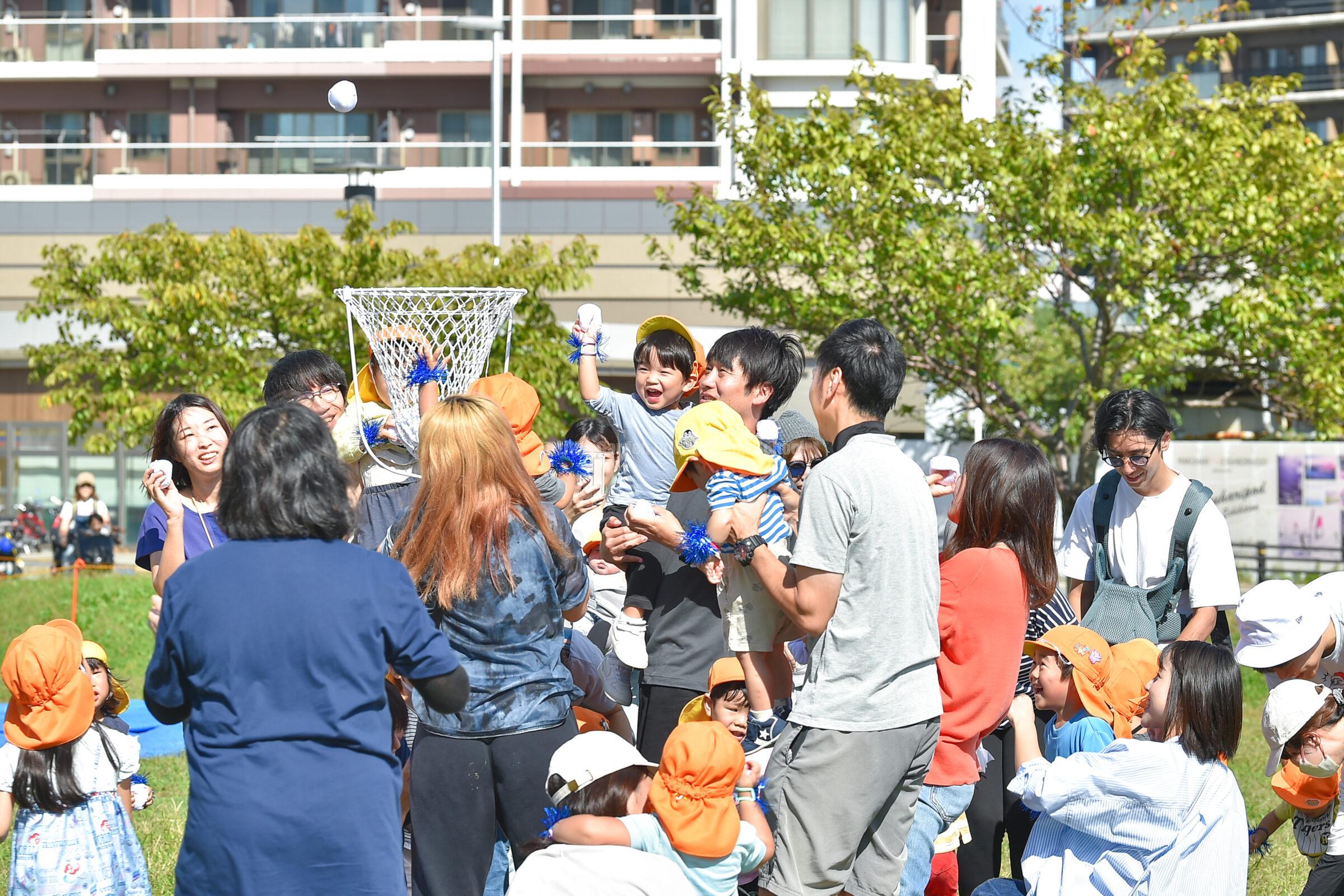 「ジャンボリミッキー」の音楽に合わせて親子でダンスを楽しみ、音楽が止まると玉入れスタート!音楽が再び流れると、みんな元気に体を動かして楽しんでいました。「がんばれー!」という声が飛び交い、親子で協力しながら玉を入れる姿に温かい笑顔が溢れました。