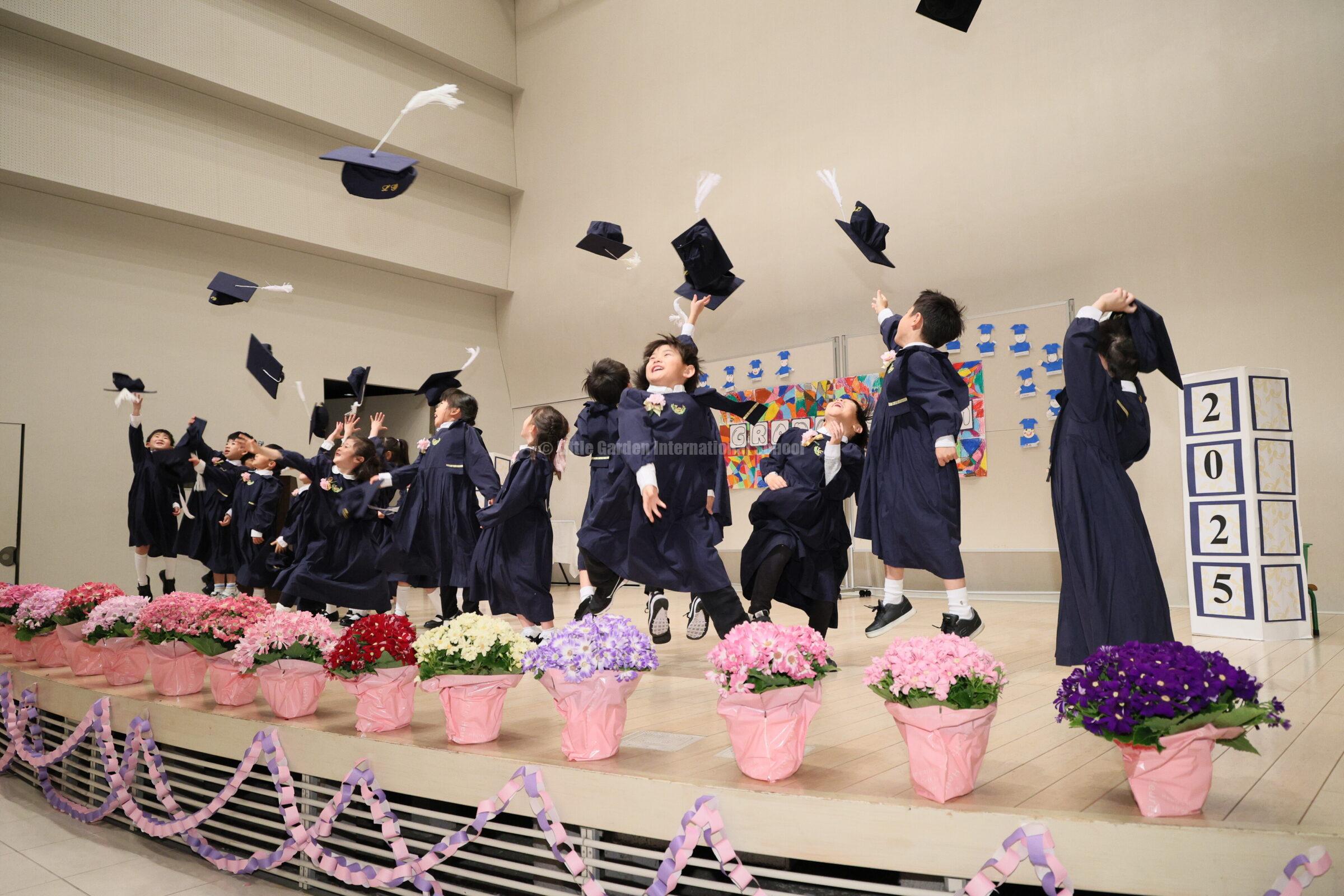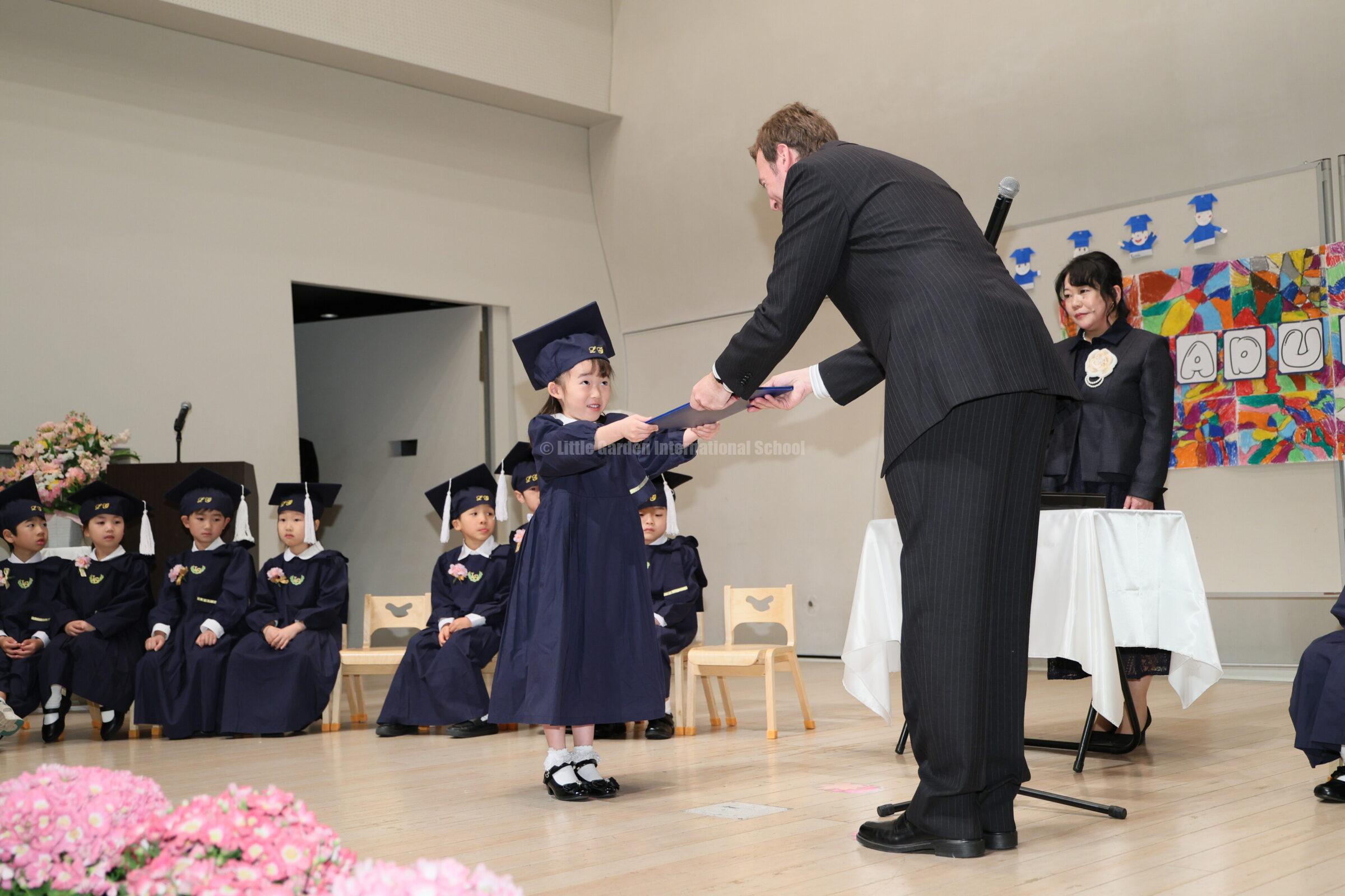 角帽、ケープを着用し、初めての登園から、たくさん笑ったり・泣いたり・いっぱい頑張ったりたくさんの思い出を胸に担任の Liam 先生から Diploma(卒園証書)を受け取りました