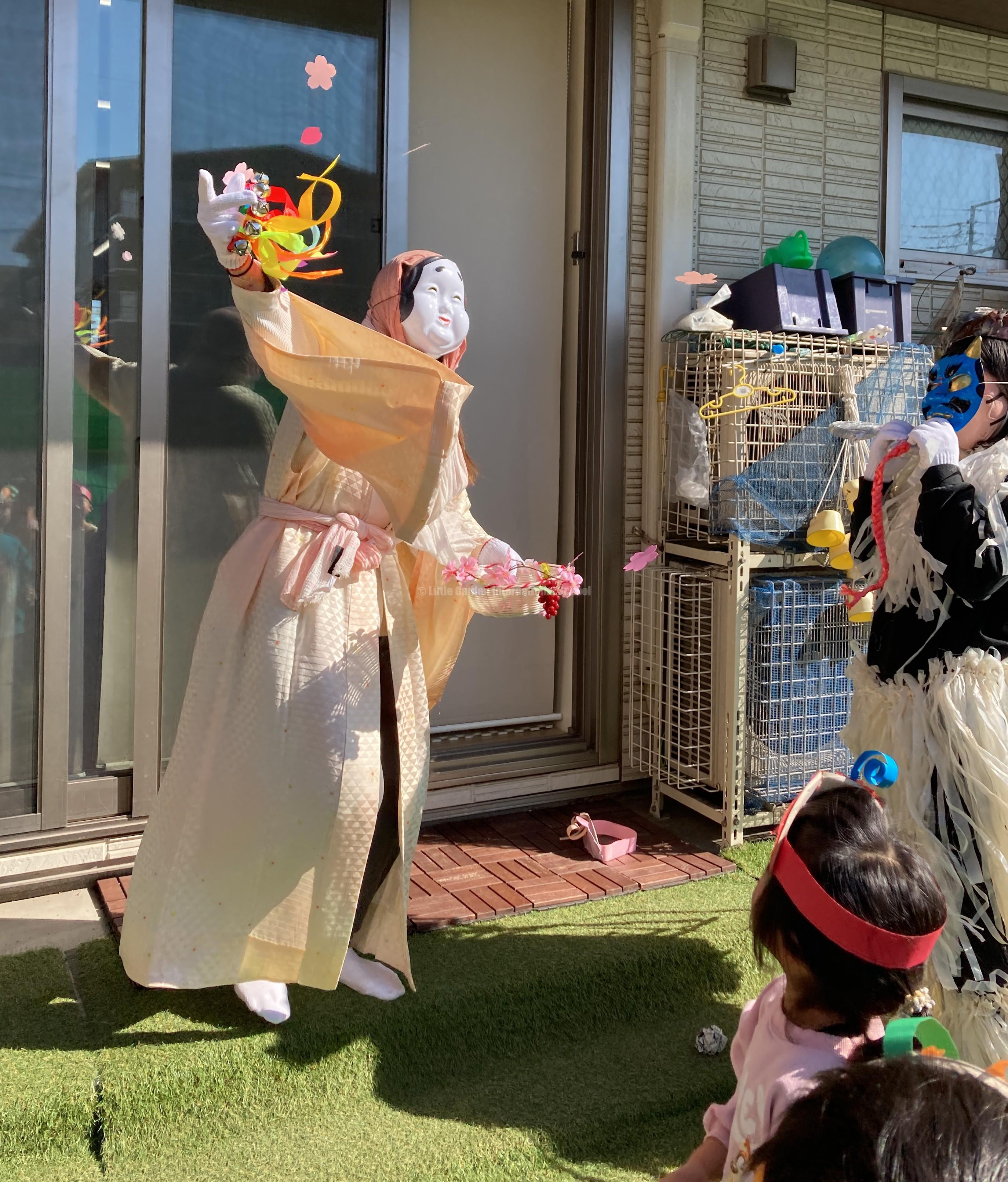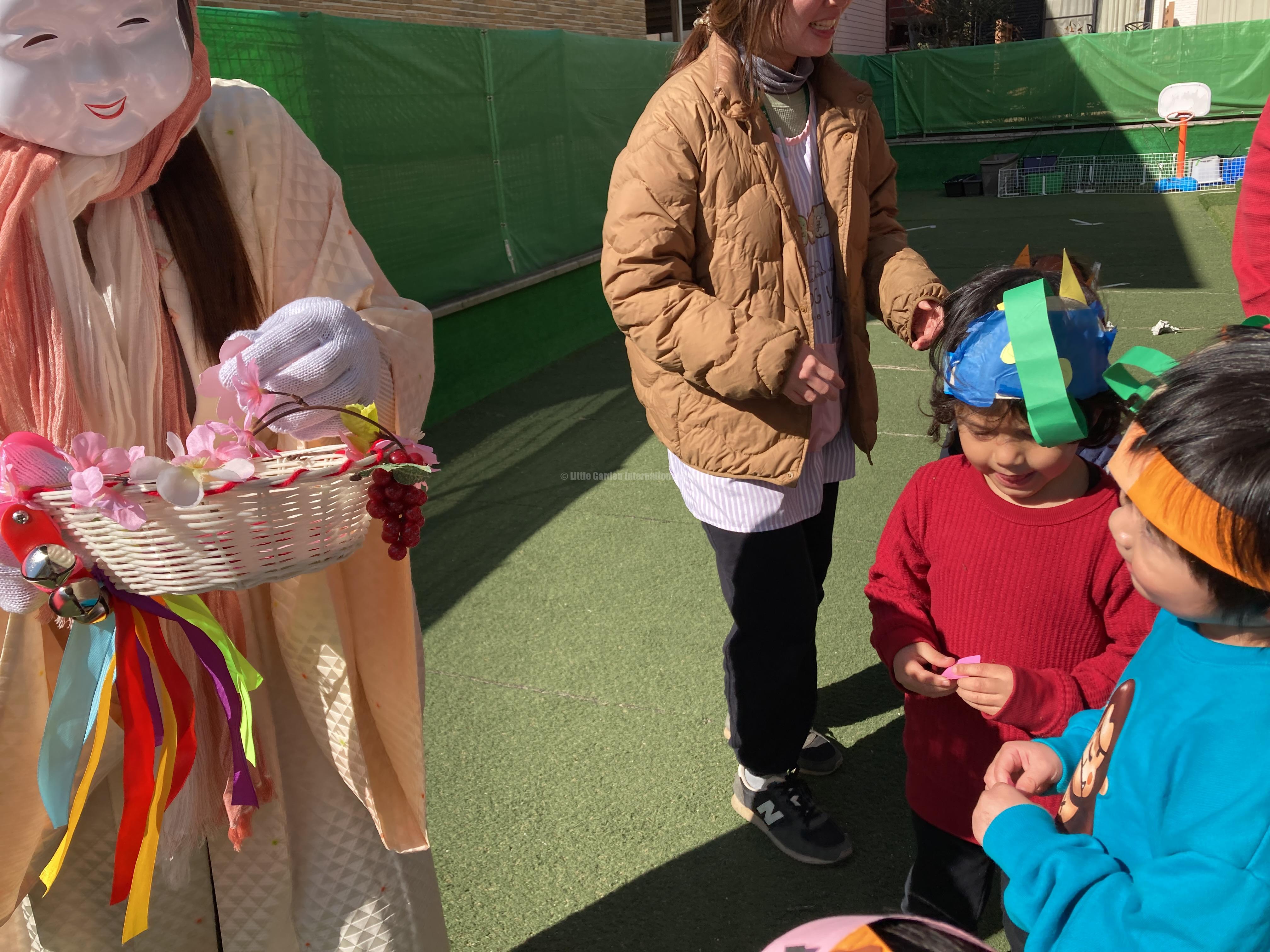 どこからか赤鬼と青鬼が現れました!突然の登場に驚いて、先生の後ろに隠れたりする子もいましたが、勇気を振り絞って、元気いっぱいに「Go away!」と豆まきをしました。