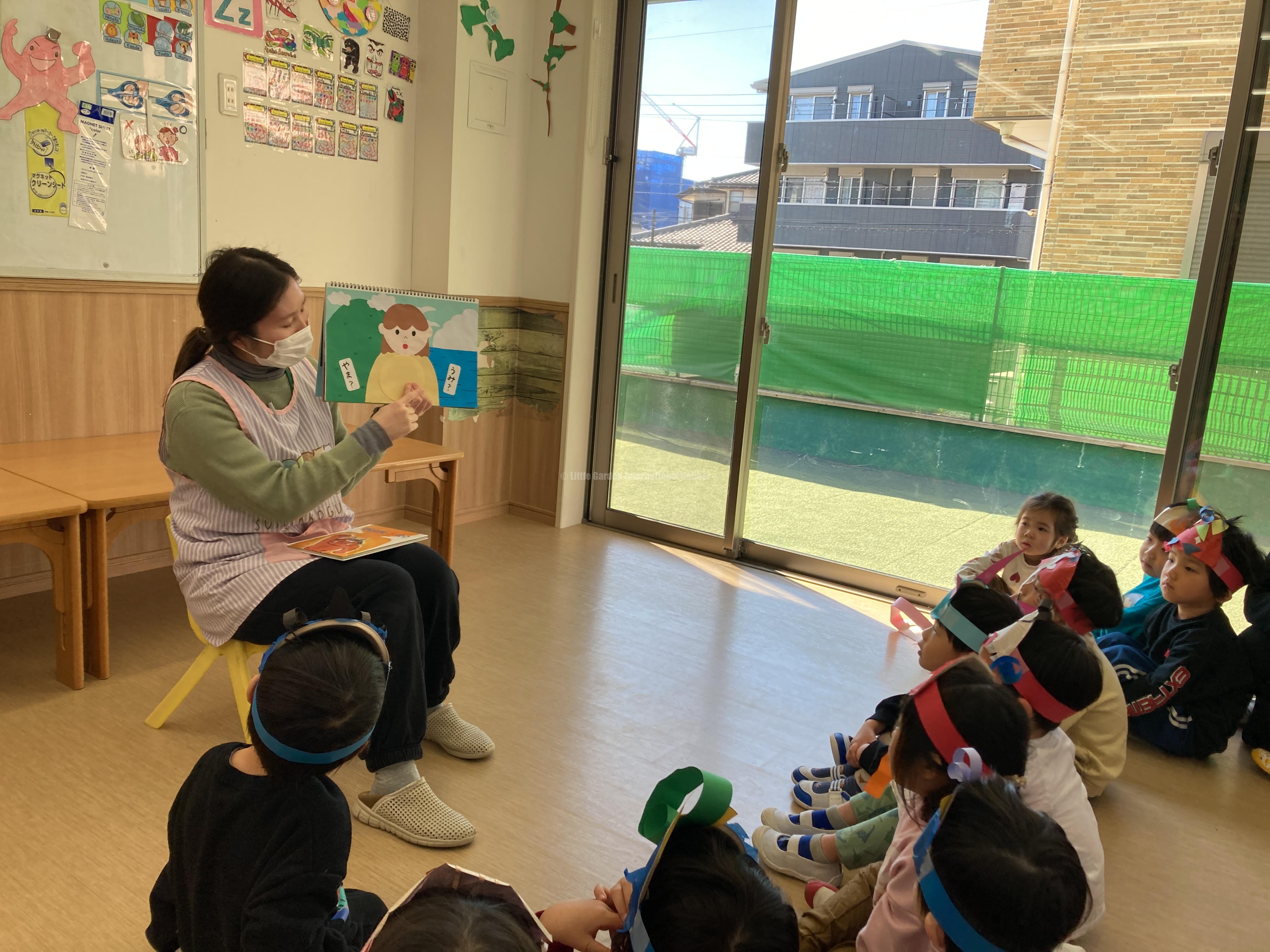 まずはスケッチブックシアターで節分のおはなしを聞きました。スケッチブックから次々と飛び出すイラストに子どもたちは興味津々!
