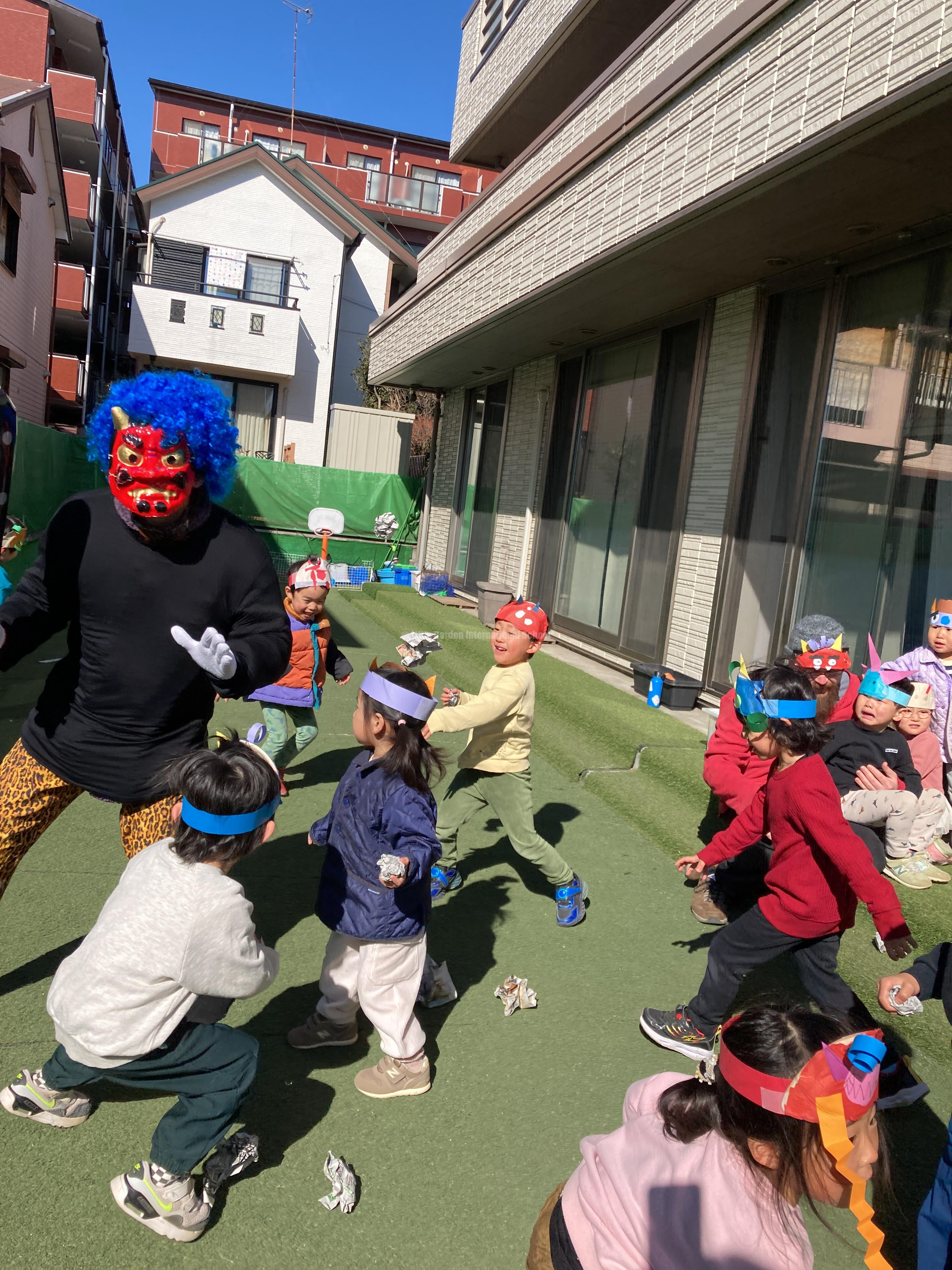 どこからか赤鬼と青鬼が現れました!突然の登場に驚いて、先生の後ろに隠れたりする子もいましたが、勇気を振り絞って、元気いっぱいに「Go away!」と豆まきをしました。