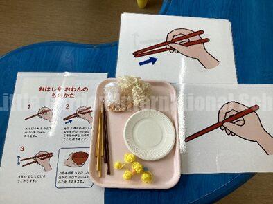 また、食育の時間には「お箸の持ち方」を練習しました。 指の位置を確認しながら、丸めた毛糸やコーンなどを使ってつかむ練習をしました。少しずつ、楽しみながら身につけていこうね🥢