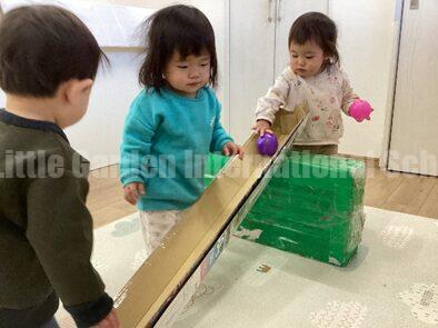 乳児クラスのお友達は、今「ボール転がし」に夢中です! お部屋の中でボールの滑り台を使ってコロコロ〜とボールを転がしています。シンプルだけど奥が深いこの遊びに、みんな目を輝かせています。