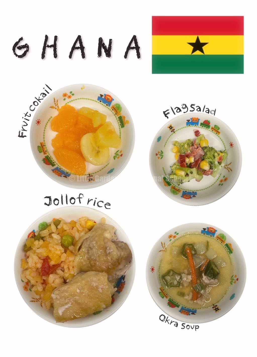ランチ前にはガーナの国旗と世界地図をみながら、「今日は日本からこんなに離れている国ガーナという国の料理がでるんだよ~」「国旗に入っている色のお野菜がたくさん入っているから探してみてね」とお話しました。