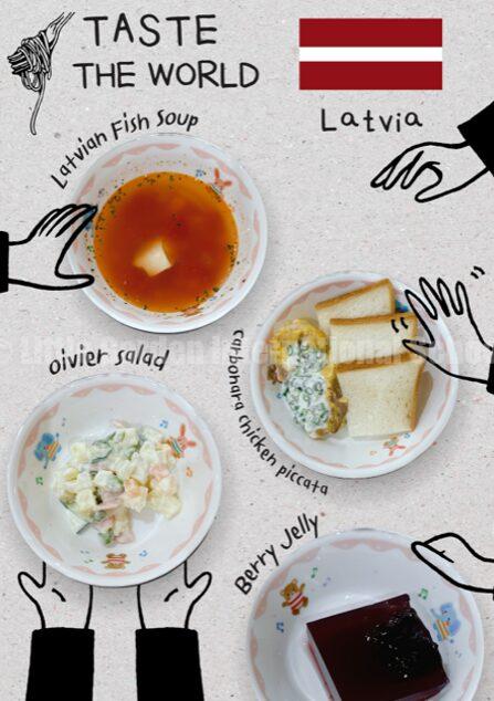 ラトビアはバルト海の東岸に位置し、料理の大部分は魚料理です。今日は、スープルィブィヌィというトマトベースのスープに、鮭をたっぷり使用しました。子供達は、「このお料理はじめてたべる!」と言って、喜んで食べてくれました。