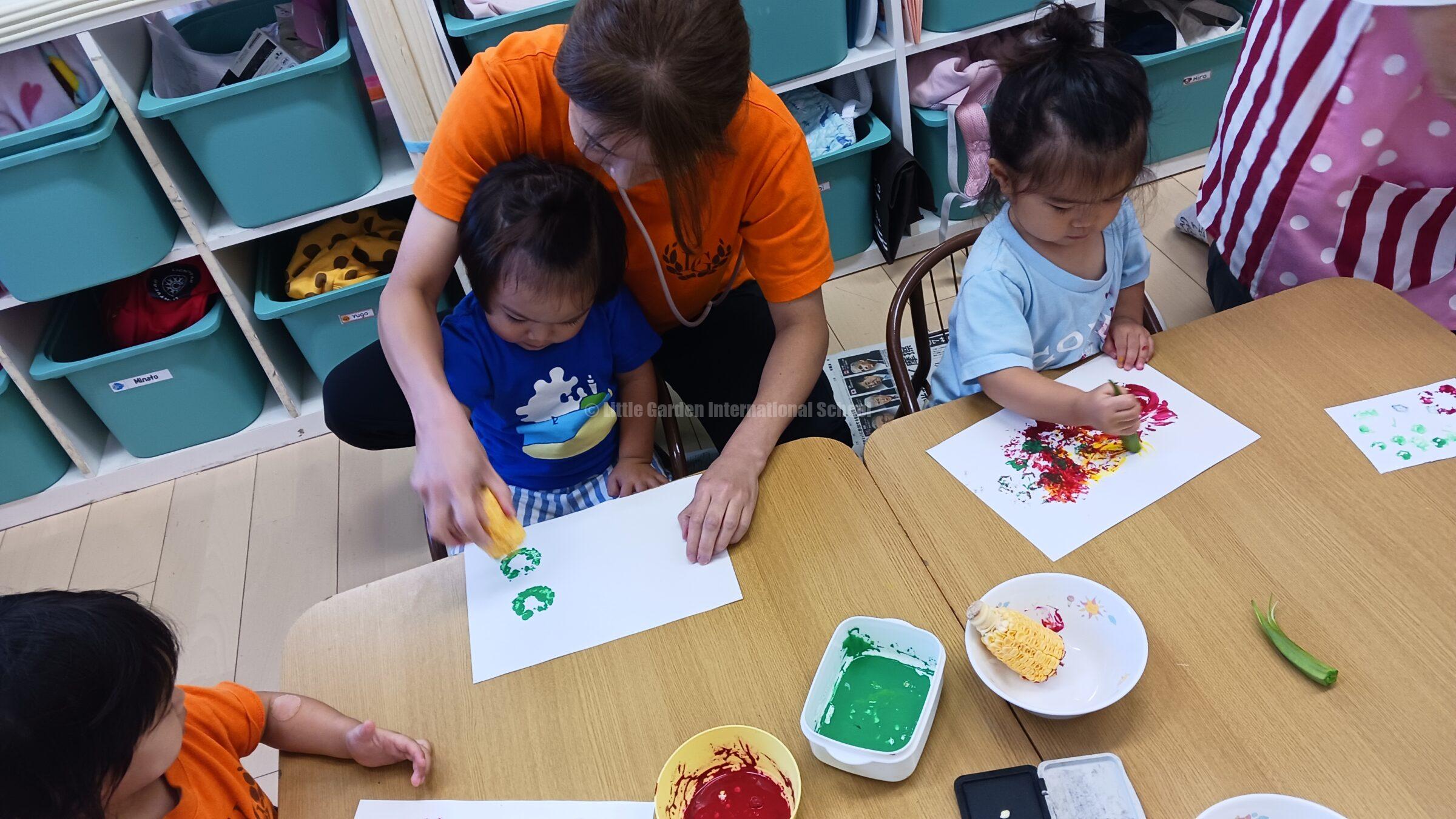 🌽Starクラスでは、とうもろこしの皮むきと野菜スタンプに挑戦。