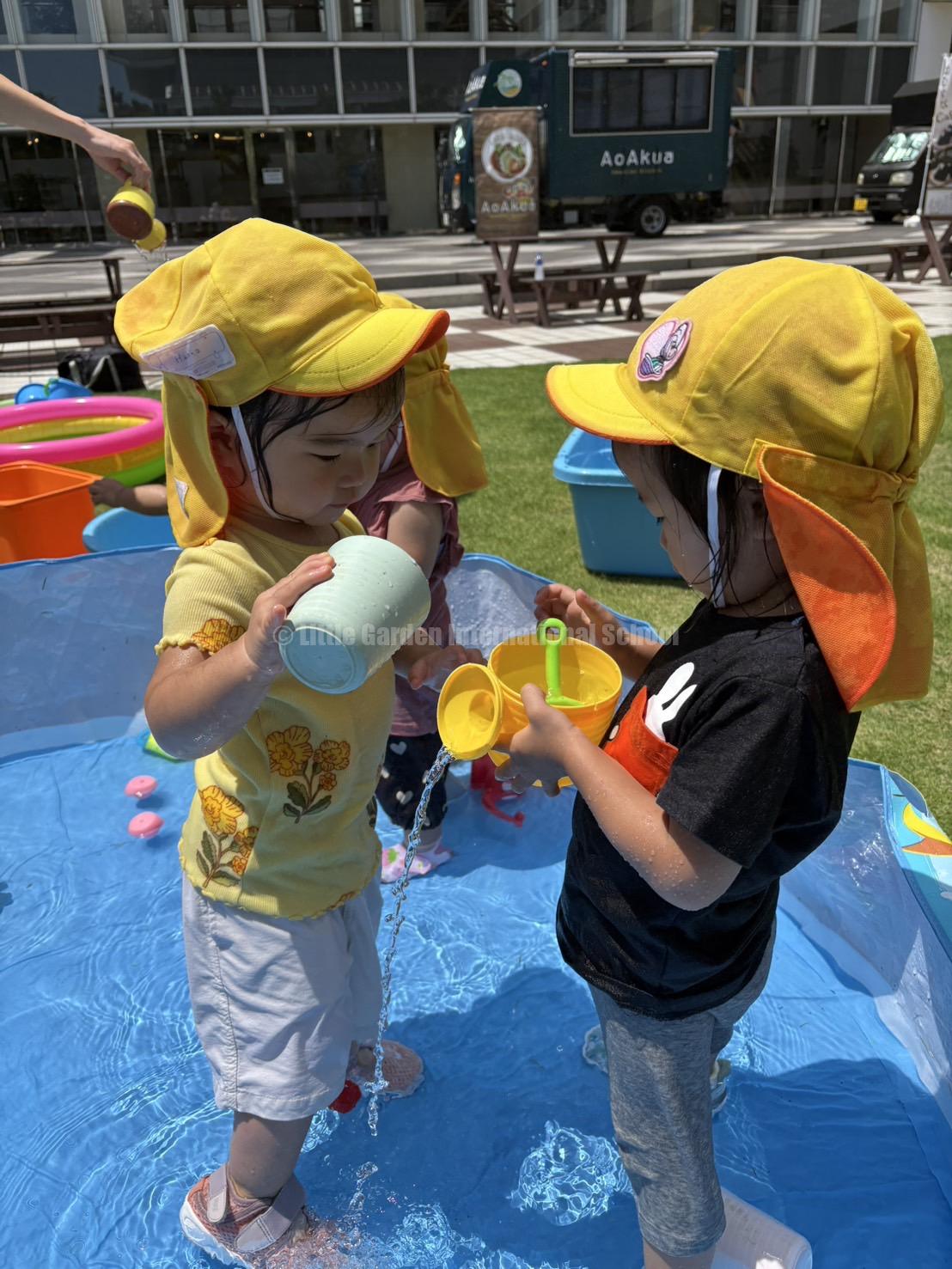 水遊びが始まりました。はじめて水遊びする子も楽しんでいます!冷たい水の感触を楽しみながら、思い切り身体を動かしています。プールバックの準備やお着替えのご協力、いつもありがとうございます。