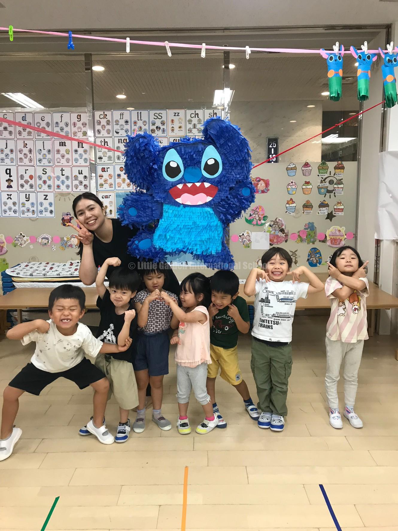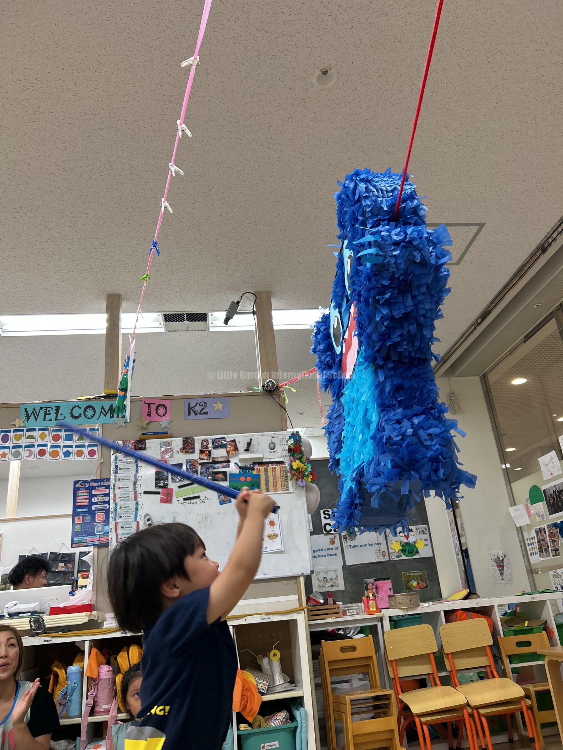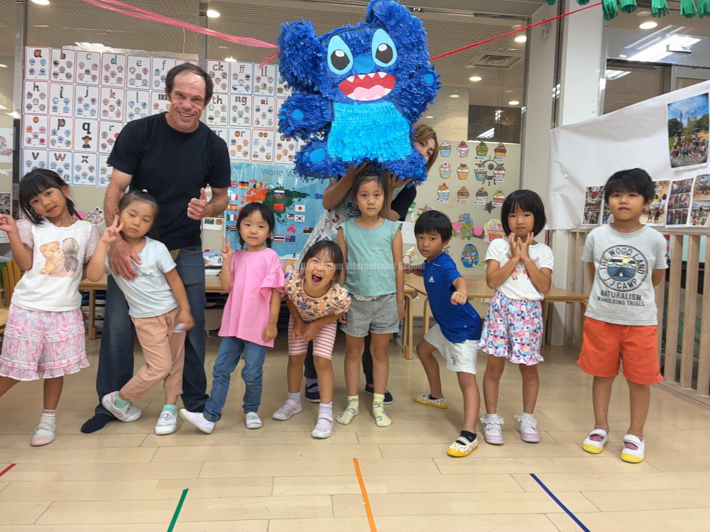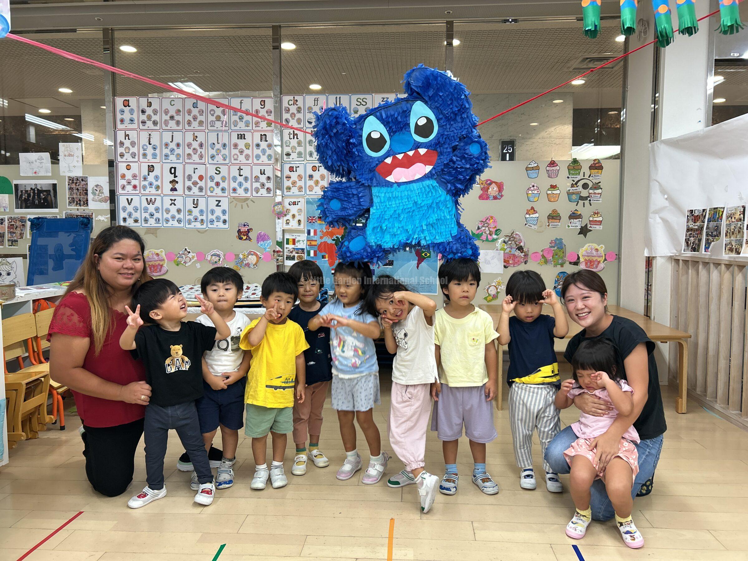 大きなスティッチのピニャータに一人ずつ挑戦し、力いっぱい棒を振り下ろします。ドキドキしながら順番を待つ子、応援の声を大きくかける子、それぞれの姿に子どもたちの成長が感じられました。