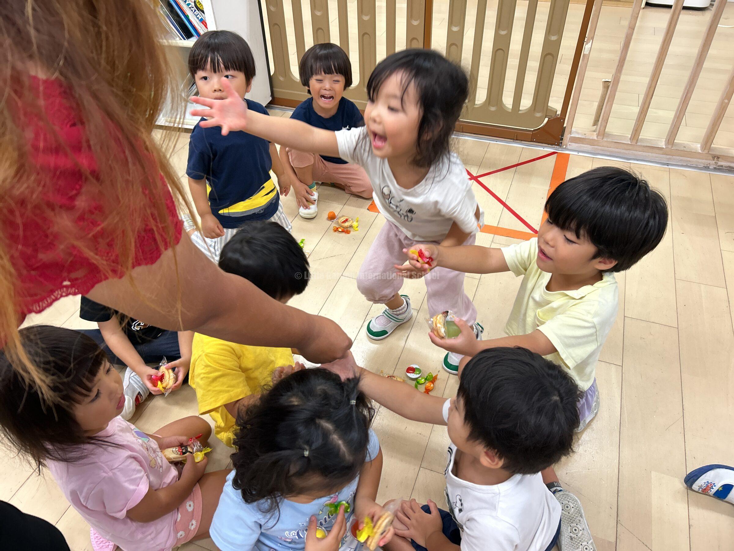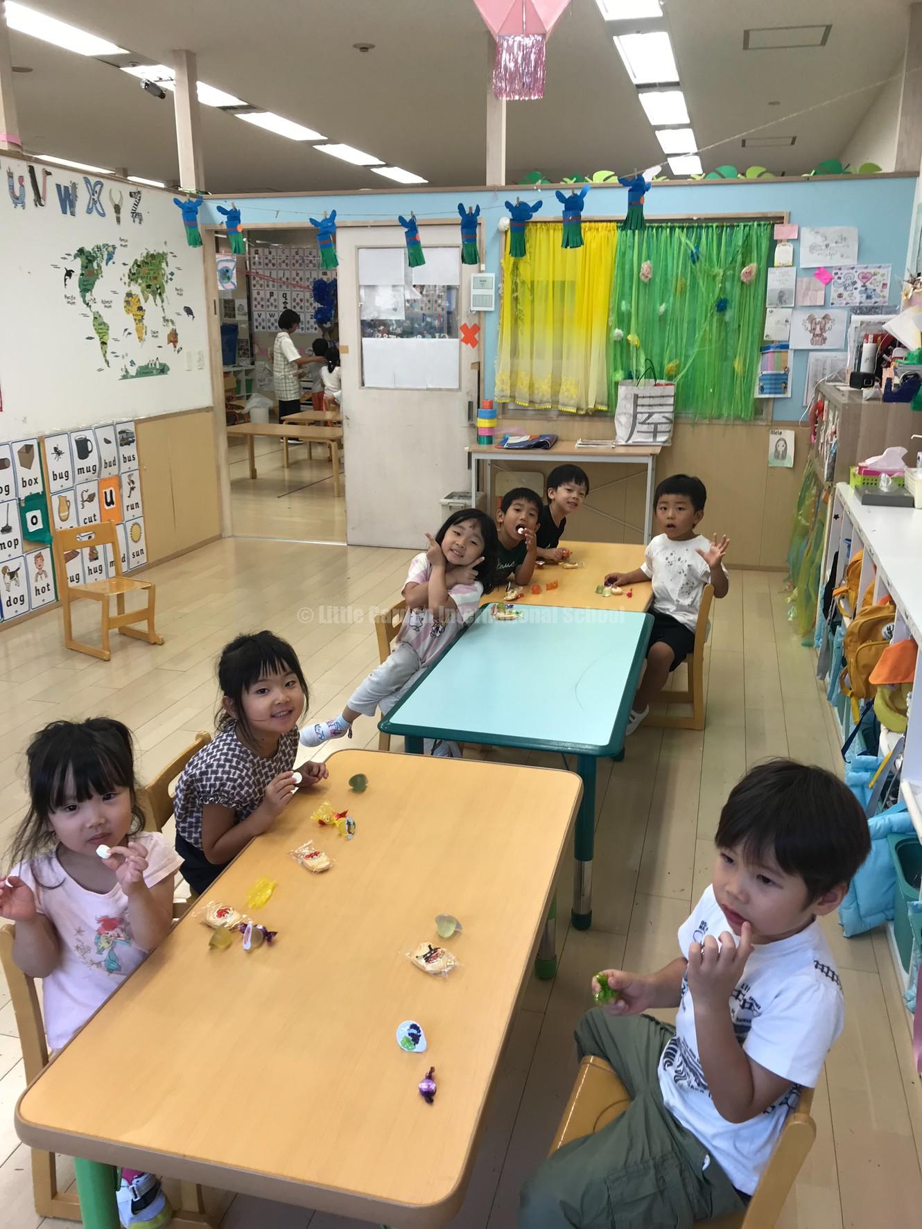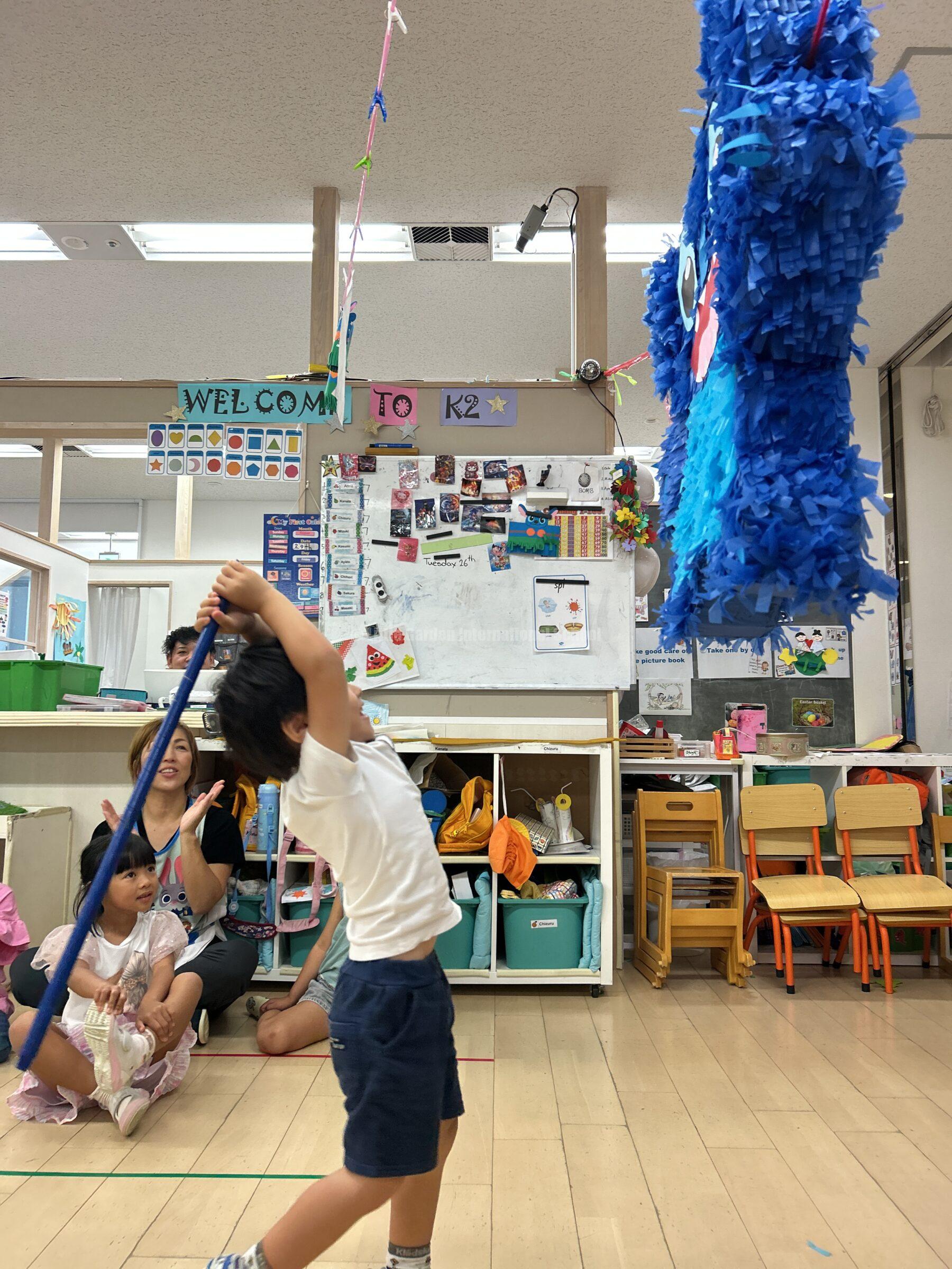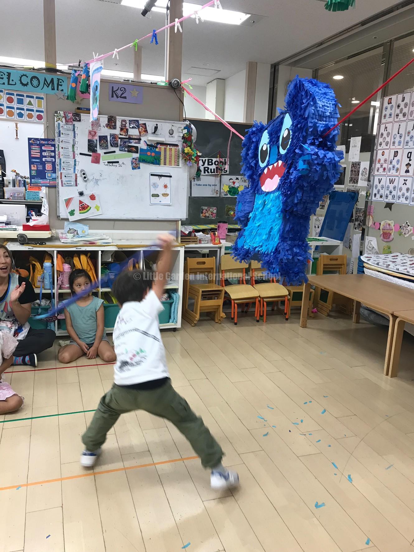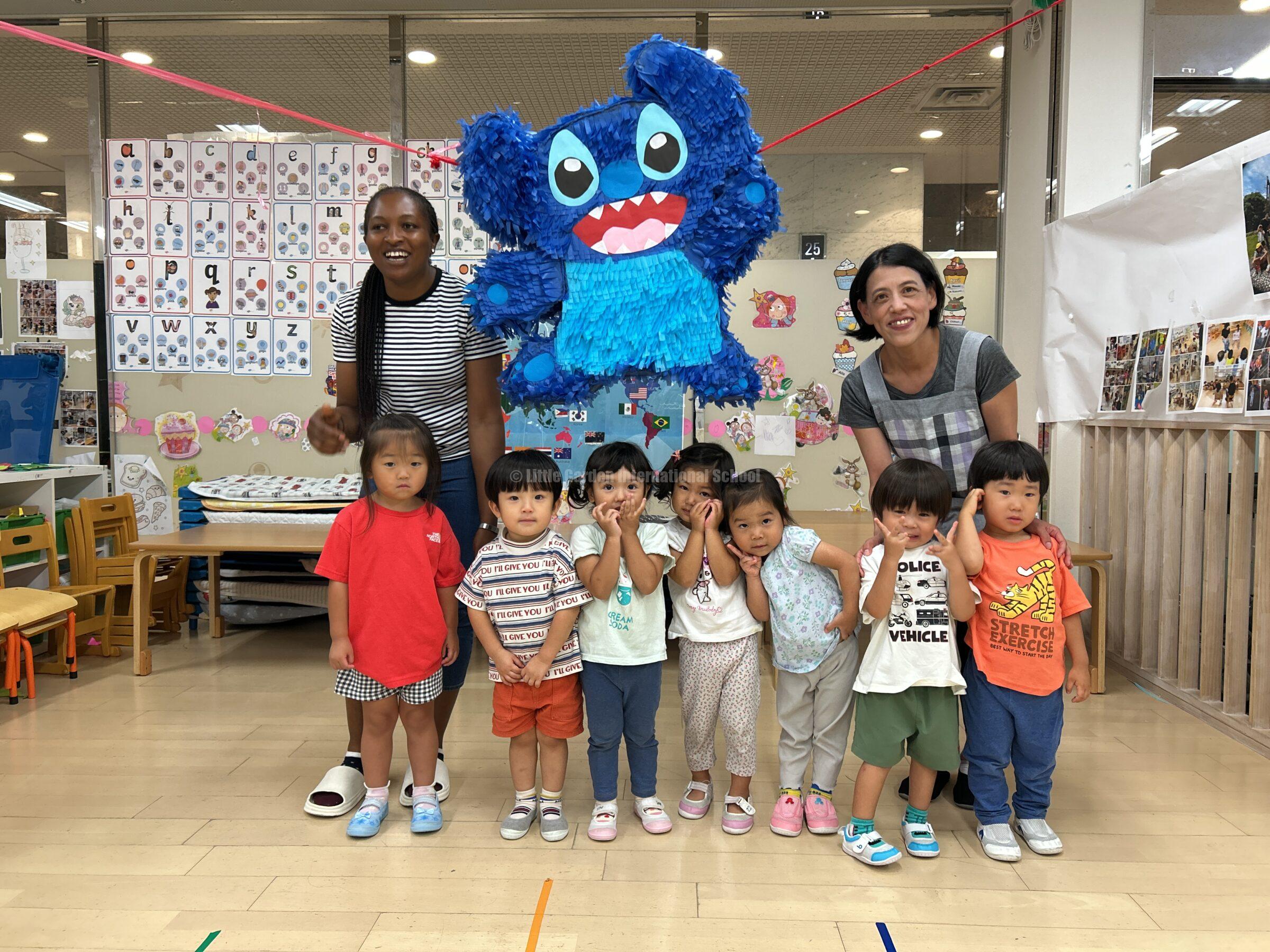 大きなスティッチのピニャータに一人ずつ挑戦し、力いっぱい棒を振り下ろします。ドキドキしながら順番を待つ子、応援の声を大きくかける子、それぞれの姿に子どもたちの成長が感じられました。