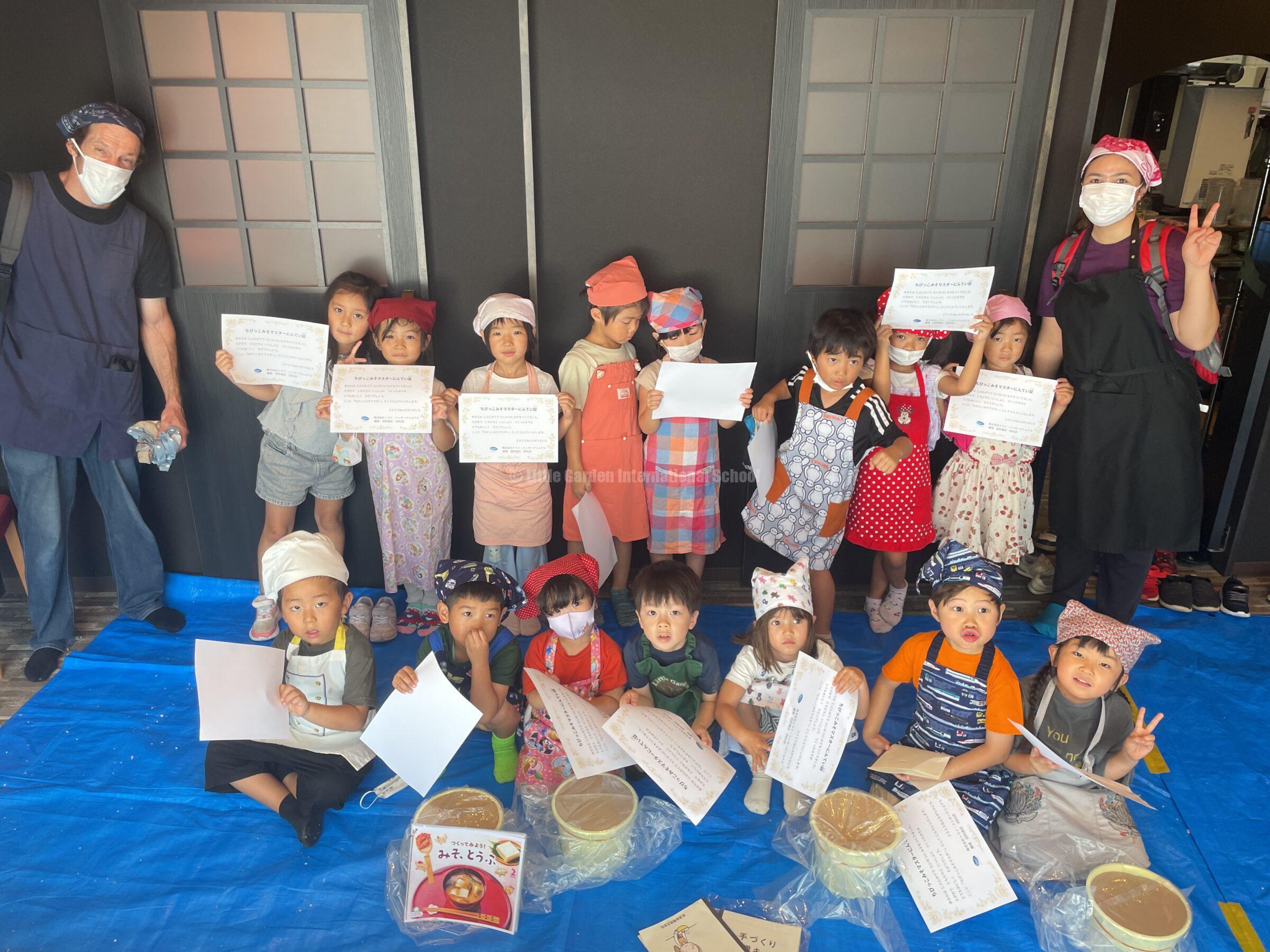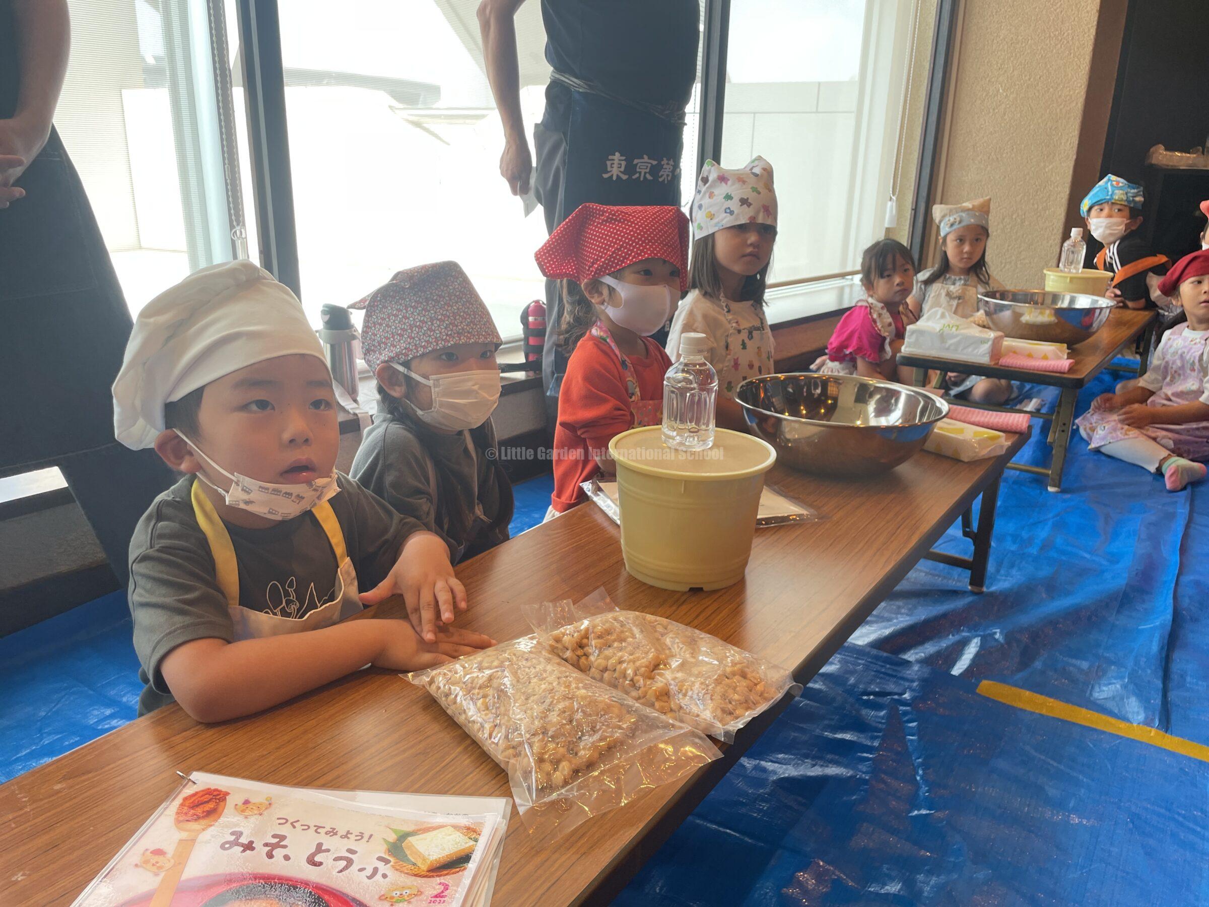 K1クラスとK2クラスの子どもたちが味噌作り体験を行いました。