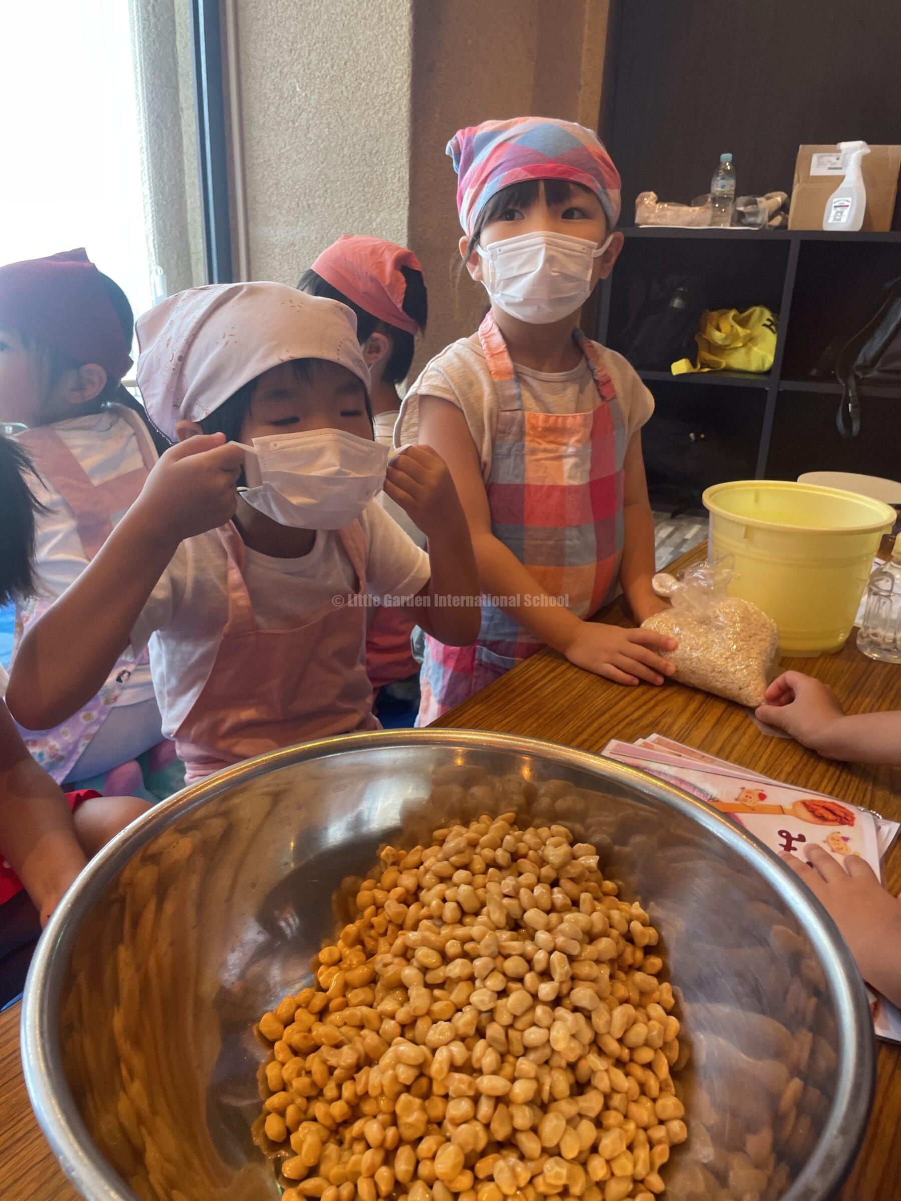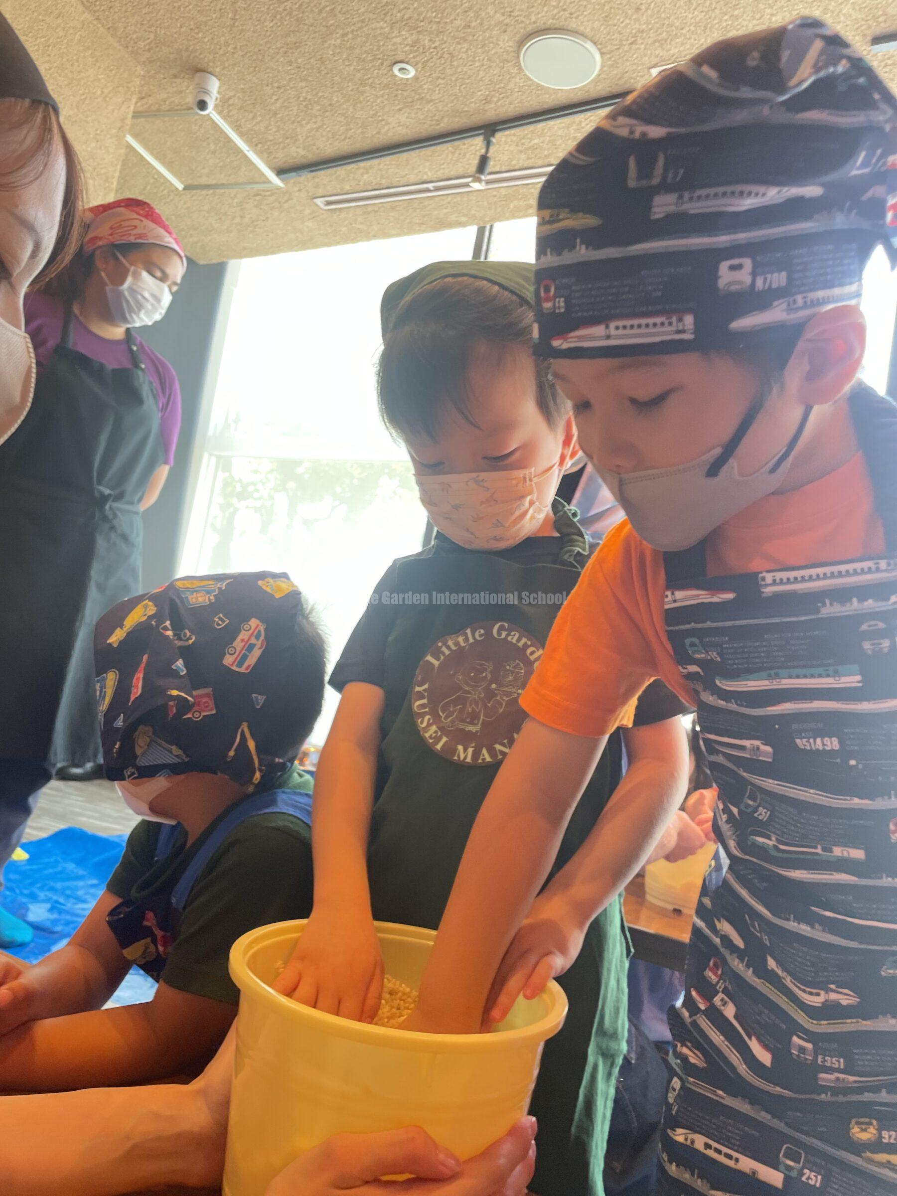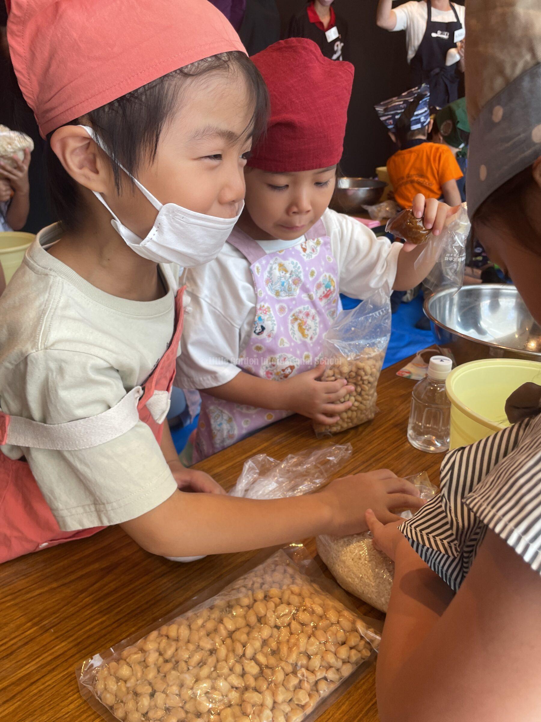 9月の食育イベントは…K1クラスとK2クラスの子どもたちが味噌作り体験を行いました。