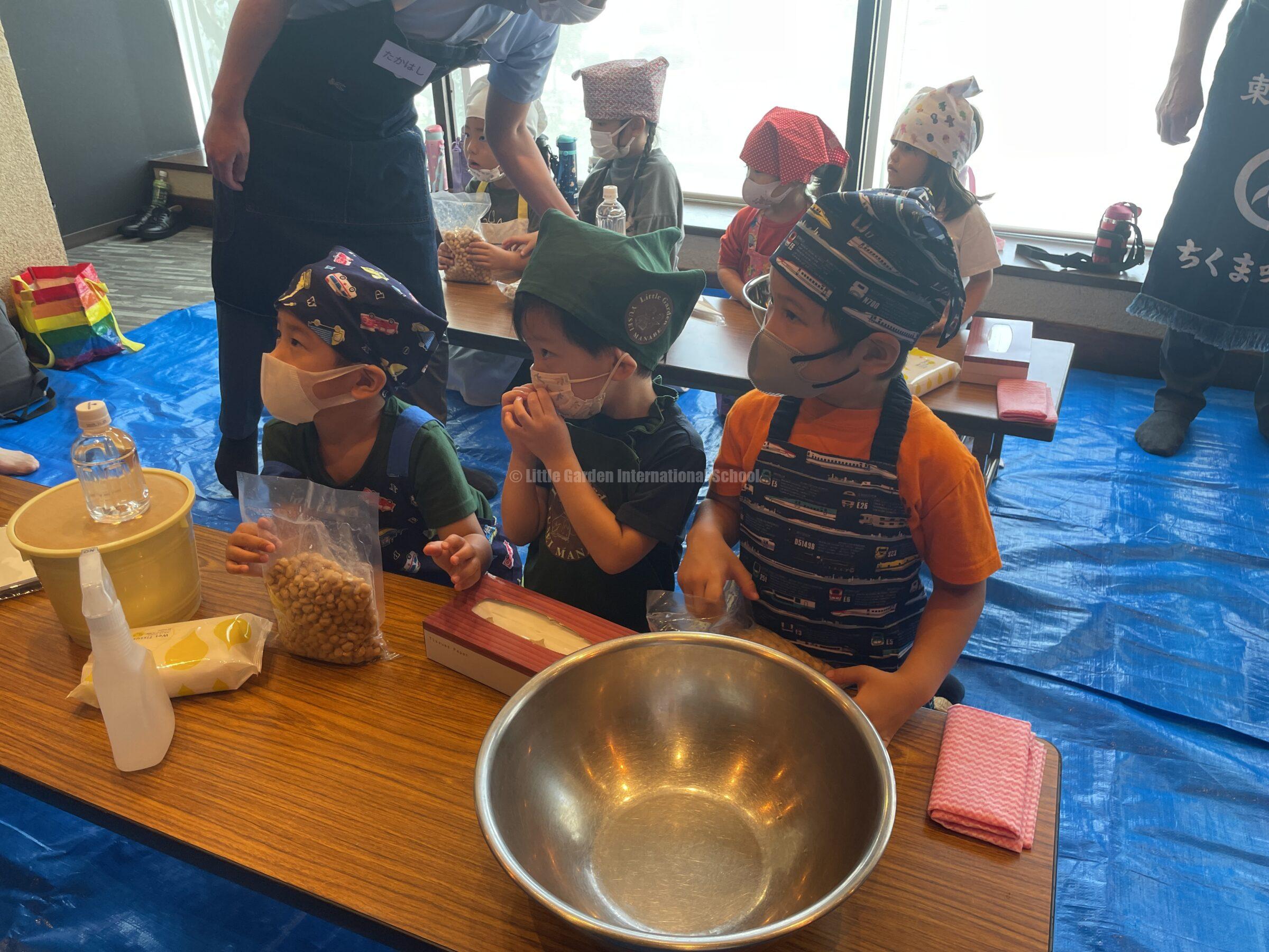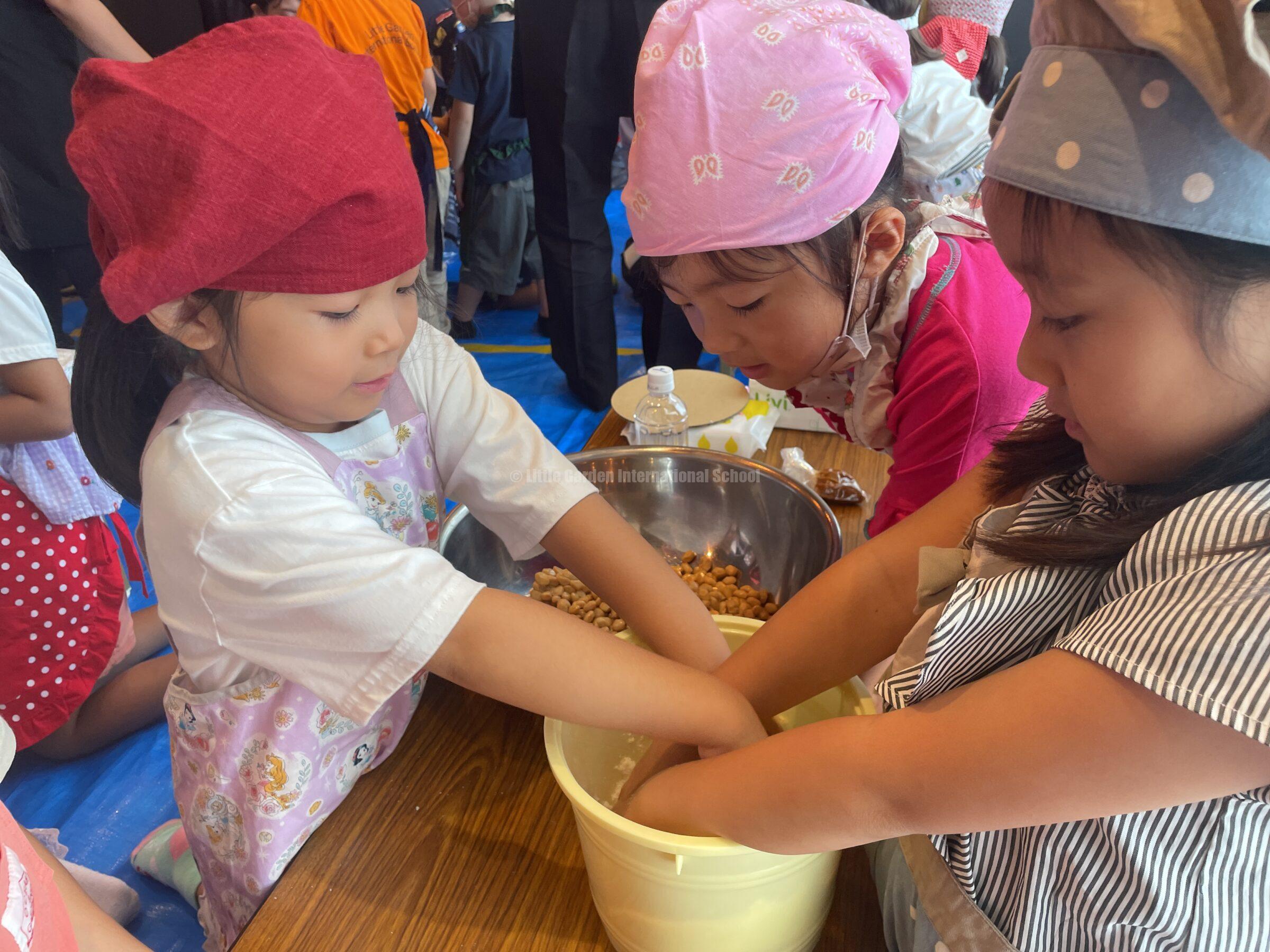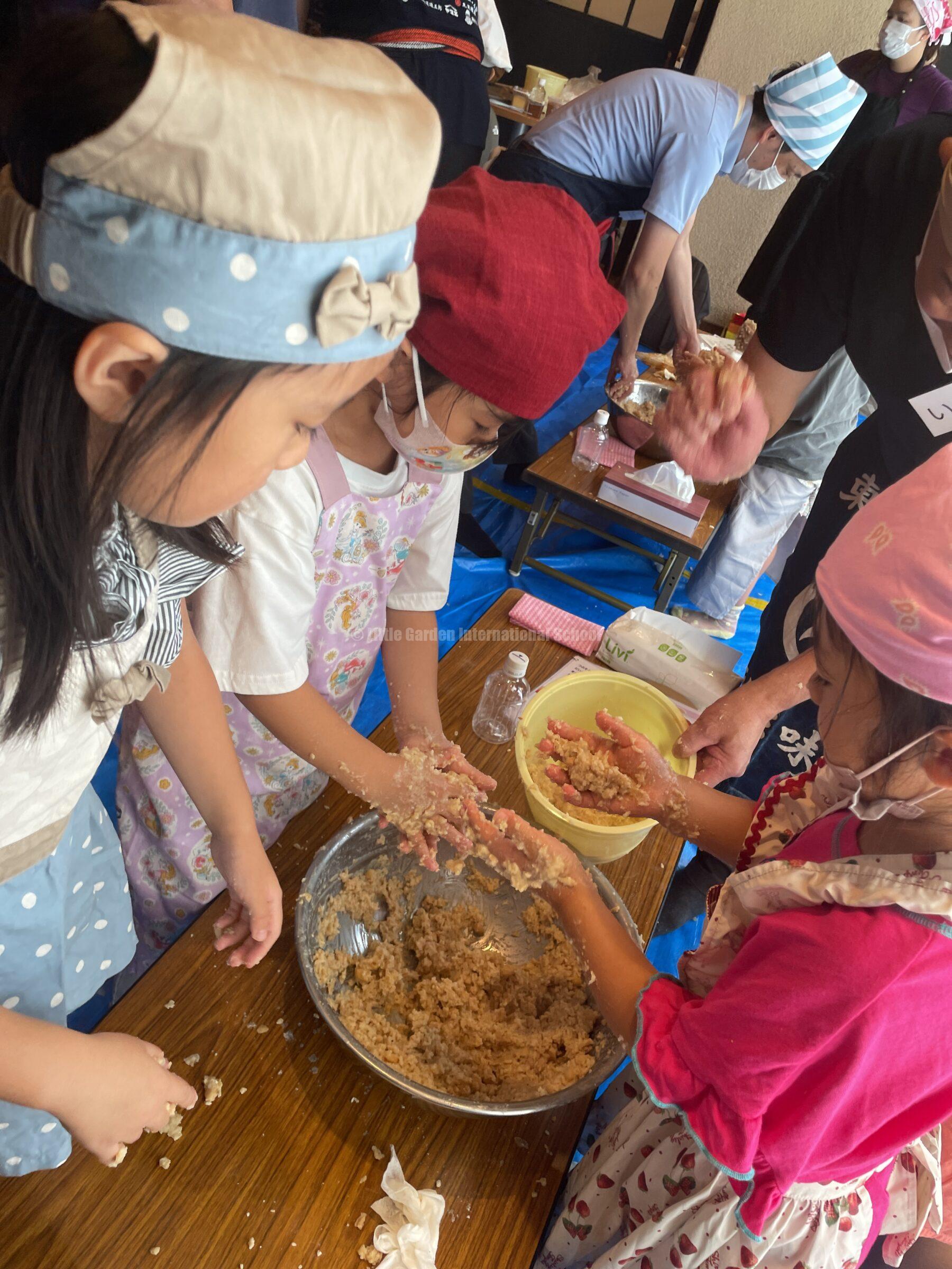 9月の食育イベントは…K1クラスとK2クラスの子どもたちが味噌作り体験を行いました。